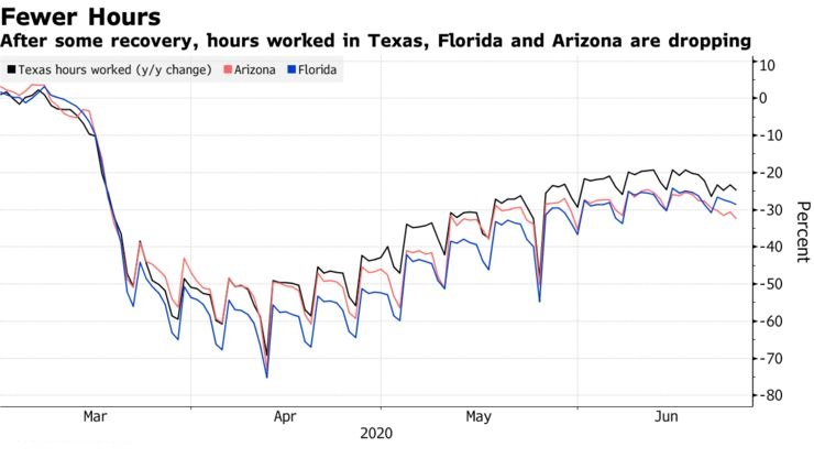 如下图所示,经历一定反弹后,德克萨斯州(黑线)、佛罗里达州(红线)和亚利桑那州(蓝线)的工作时间出现下滑