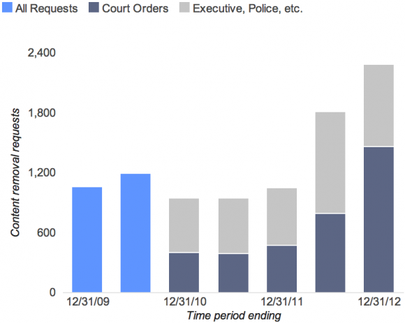 这次的报告数据是自谷歌开始发布《透明度报告》以来数据最高的一次。在2012年的上半年,谷歌只收到了1811份来自政府的删除请求以及18070条要求被删除的内容。