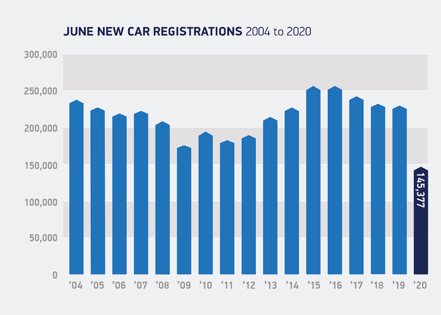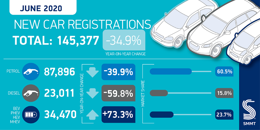 根据SMMT公布的数据, 6月份英国新车注册量下降了34.9%,这比5月份(下降89%)有所改善。6月新车注册数量为145377辆,仍比2019年6月大幅下降了78044辆。