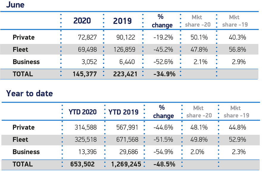 事实证明,私人需求比企业更具弹性。前者在6月份下降了19.2%,居家隔离前的订单贡献了72827辆新注册车辆,占市场份额的一半以上。由于企业在支出审查中暂停采购,车辆销量大幅下降45.2%,降至69498辆。