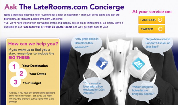 LateRooms的礼宾服务是一个很有趣的在线问答服务,消费者可以通过像Twitter和Facebook这样的社交网络来询问LateRooms团队有关其服务和产品的问题,他们会针对这些问题提供有用且相关的答复。除此以外,他们还会参与到这些受欢迎的社交网络的讨论当中和发表评论。