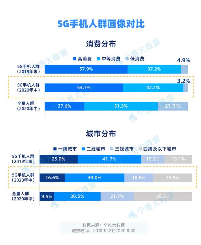 同时,随着5G手机款式和定位的不断丰富,5G手机用户的消费结构也发生了变化。最新的5G手机用户消费分布中,中等消费水平用户的占比为42.1%,相比2019年末提升近5个百分点。