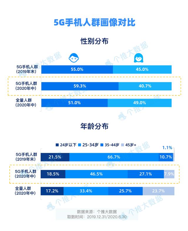 每日互动个推大数据也更新了5G手机人群用户画像,并与2019年末的5G人群画像情况进行了对比。从性别分布来看,最新的5G手机用户中男女比例分别为59.3%和40.7%,其中男性用户的比例相比2019年末的55.0%提升了4.3%,超出了全量人群中的男性占比,可见在5G手机对男性用户的吸引力更大。
