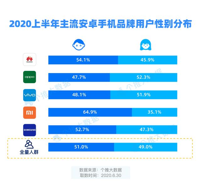 截至2020上半年,华为、三星用户中性别分布与全量人群性别分布较为接近。OPPO和vivo手机用户画像呈现出新面貌,OPPO手机的女性用户占比52.3%,vivo手机女性用户占比51.9%,均超过了全量人群女性占比。OV手机深懂女性用户,不仅在外观颜值和拍照功能上下足了功夫,还冠名多档综艺节目、请顶级流量明星助阵,难免让女性同胞们爱不释手。