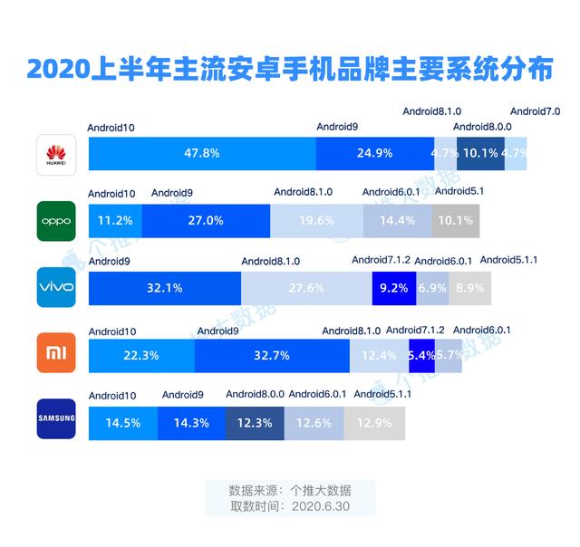 从主要系统分布来看,华为、小米、三星和OPPO手机用户已有不少升级到Android 10系统,其中,Android 10系统在华为系手机中的占比高达47.8%。