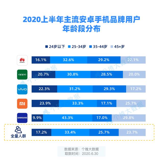 每日互动个推大数据显示,OPPO、vivo和小米手机24岁以下用户占比均高于全量人群24岁以下人群占比,95后、00后成为新锐主力。另外,三星手机25-34岁年龄段用户占比达43.3%,远高于全量人群中该年龄段人群占比,三星手机的85后、90后用户正在崛起。