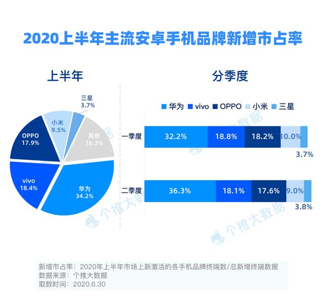 从新增市占率来看,2020上半年华为新增市占率34.2%,排名第一;vivo新增市占率18.4%,排名第二;OPPO新增市占率17.9%,排名第三。