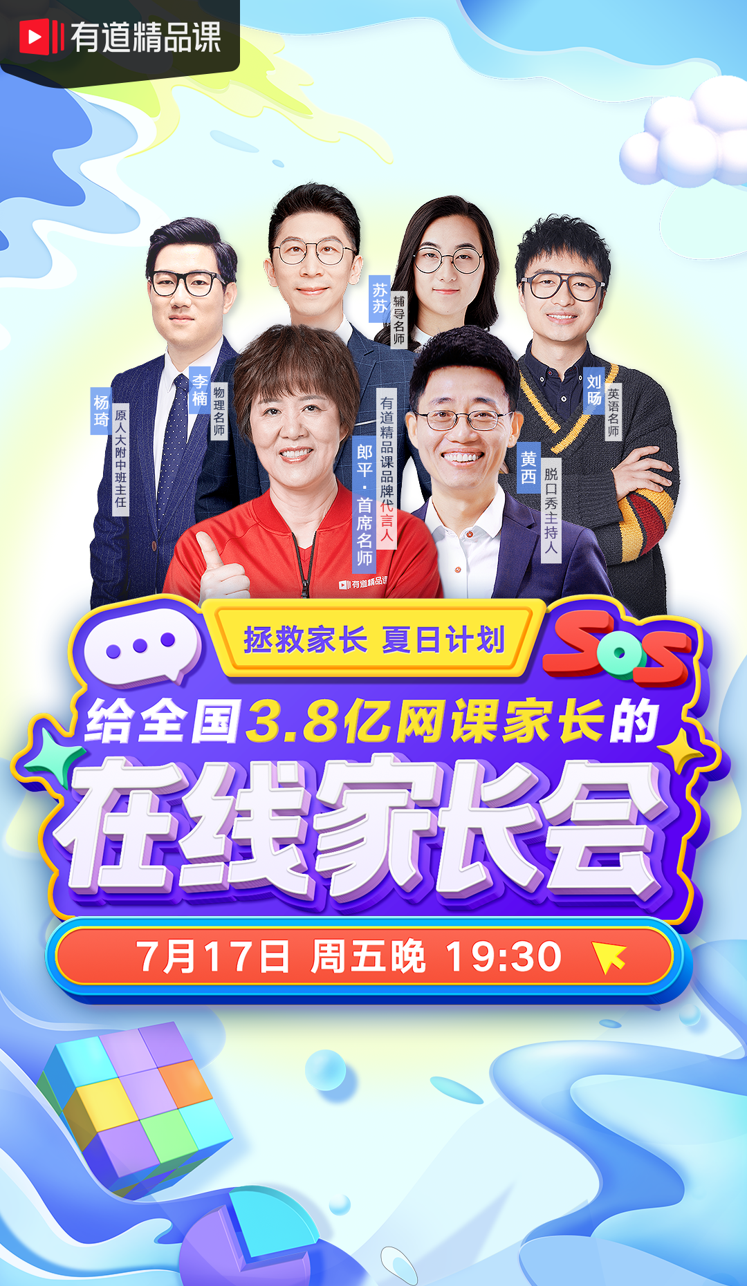 与此同时,全国各地中小学生与家长因上网课而产生的“水土不服”现象也开始浮出水面:网课真的有效果吗?如何让孩子上网课时集中注意力?为什么我的孩子上网课总玩手机怎么办?为了帮助家长们解决网课困惑,网易旗下在线教育品牌有道精品课将于7月17日晚19:30针对全国3.8亿中小学生网课家长举办首次在线家长会。