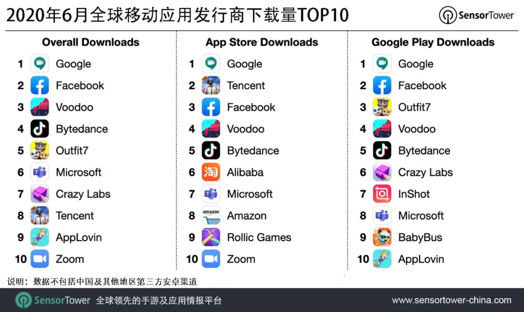Sensor Tower 商店情报数据显示,Google以3.17亿次下载,位列2020年6月全球移动应用发行商下载榜榜首,较2019年6月增长68.5%。全球移动应用发行商下载量Top10完整榜单请见上文图表。(注:下载量仅统计App Store和Google Play,不包括中国及其他地区第三方安卓市场。)