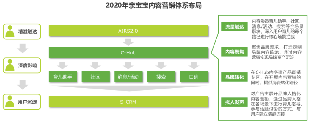 以亲宝宝为例, 亲宝宝内容营销体系布局主要围绕用户的消费路径展开。首先通过AIRS 2.0系统帮助品牌主找到更精准的用户群体;其次通过C-Hub对用户展开全面的内容渗透,在多个场景进行品牌内容布局,结合拟人化策略和转化路径植入,帮助品牌主与用户建立深度情感联系,设置产品直销专区增大品牌变现机会;最后通过S-CRM将深度链接的用户沉淀为用户数据资产,展开长期持续的培育和互动,从而实现对用户整个生命周期的深度营销。