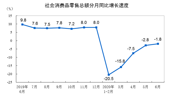 6月份,社会消费品零售总额33526亿元,同比下降1.8%(扣除价格因素实际下降2.9%,以下除特殊说明外均为名义增长),降幅比上月收窄1.0个百分点。其中,除汽车以外的消费品零售额29914亿元,下降1.0%。