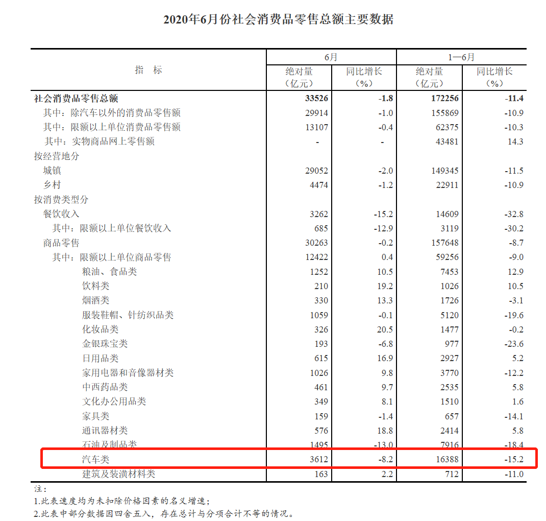 1—6月份,社会消费品零售总额172256亿元,同比下降11.4%。其中,除汽车以外的消费品零售额155869亿元,下降10.9%。