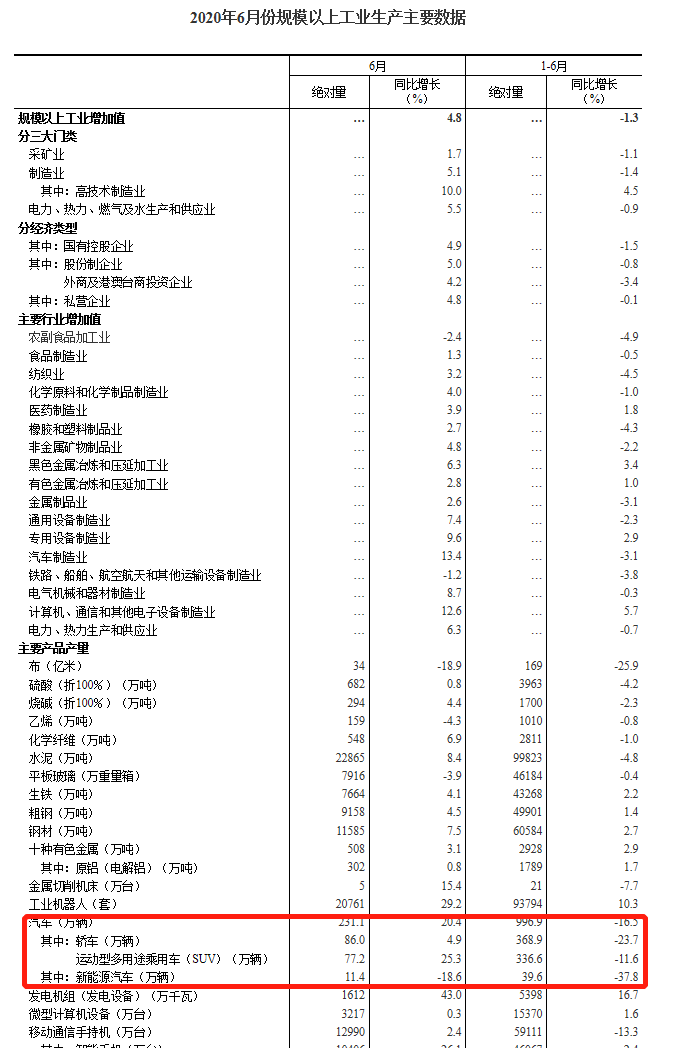 分产品看,6月份612种产品中有355种产品同比增长。钢材11585万吨,同比增长7.5%;水泥22865万吨,增长8.4%;十种有色金属508万吨,增长3.1%;乙烯159万吨,下降4.3%;汽车231.1万辆,增长20.4%,其中,新能源汽车11.4万辆,下降18.6%。