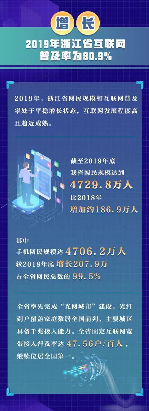 报告显示,浙江省网民规模和互联网普及率处于平稳增长状态。截至2019年底,浙江省网民规模达到4729.8万人,比2018年增加约186.9万人,互联网普及率为80.9%。其中,手机网民规模达4706.2万人,占全省网民总数的99.5%。
