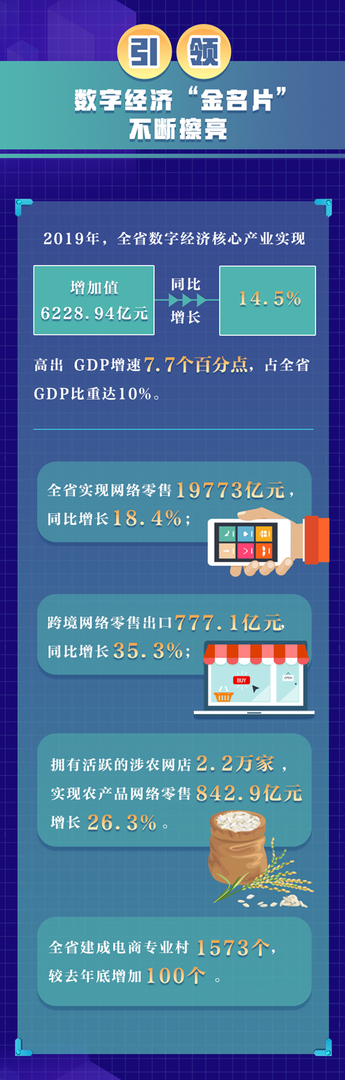 数字经济为浙江高质量发展注入新动能,“金名片”越发亮眼。智能AI芯片等技术领域自主知识产权进一步强化,与5G结合的相关前沿技术开始进入研发阶段,物联网技术应用开始布局……报告显示,2019年,全省数字经济核心产业实现增加值6228.94亿元,占全省GDP比重达10%。作为数字经济最活跃、最集中的表现形式之一,浙江省电子商务发展继续引领全国。去年,全省实现网络零售19773亿元,比上年增长18.4%。
