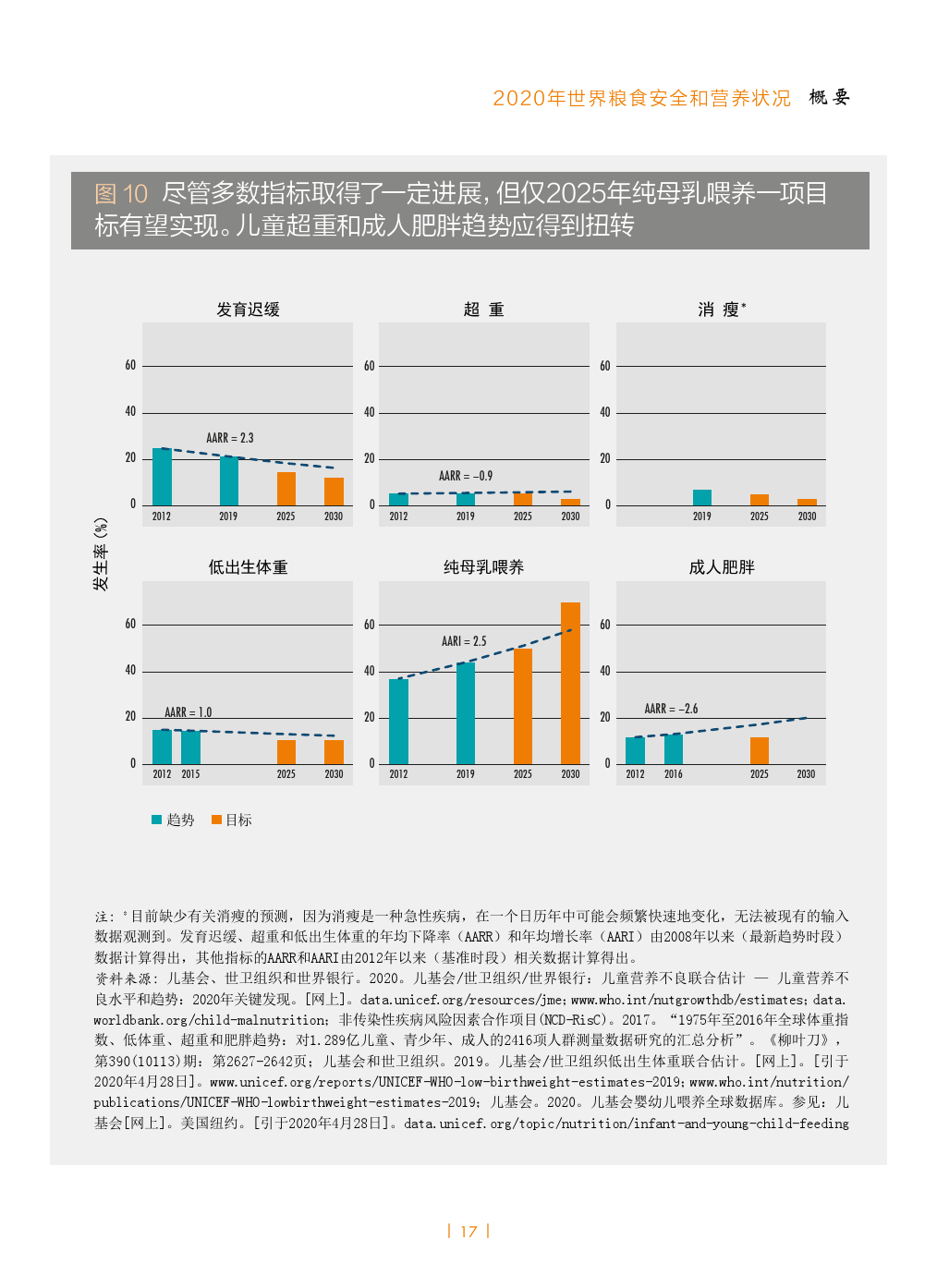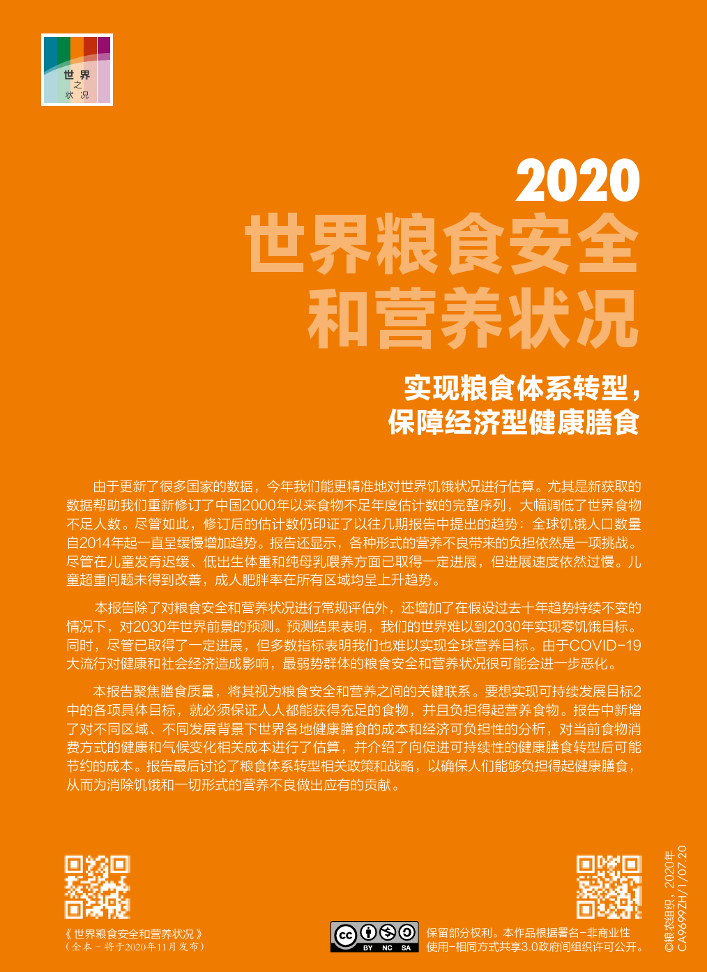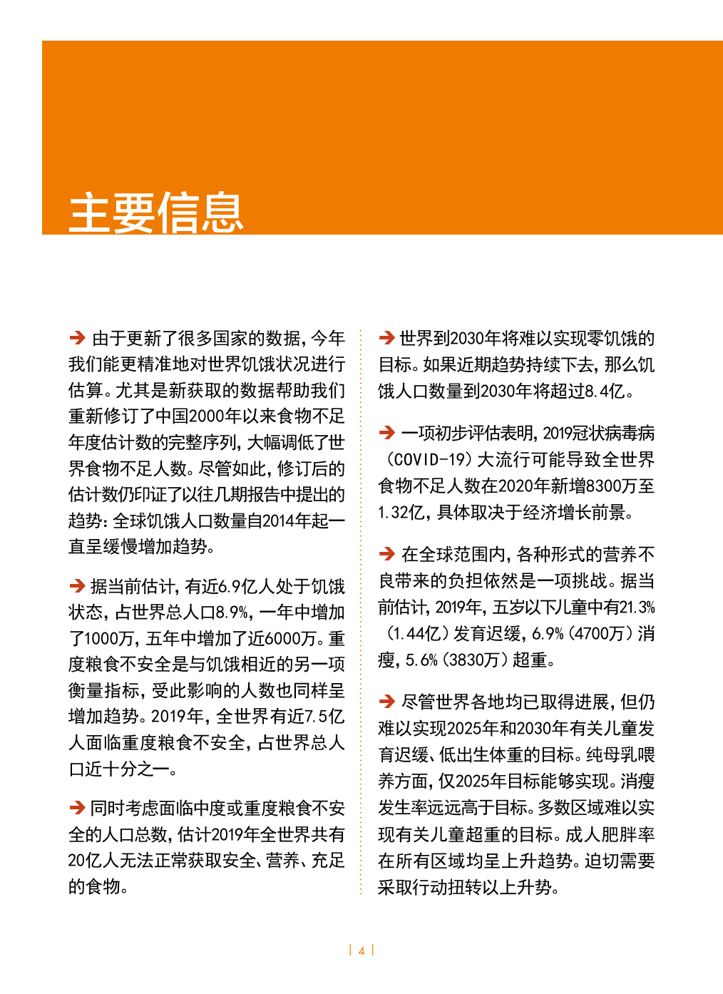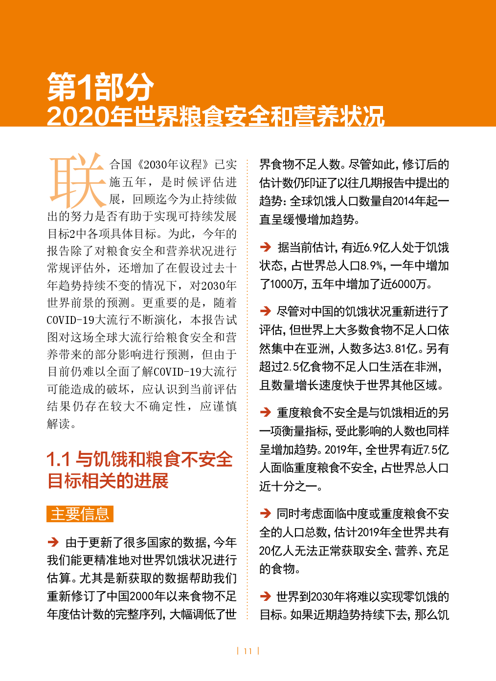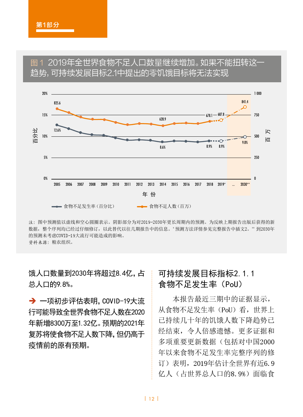 报告除了对粮食安全和营养状况进行常规评估外,还增加了在假设过去十年趋势持续不变的情况下,对 2030 年世界前景的预测。发布报告的五家机构负责人指出,距离在2030年实现零饥饿、结束粮食不安全状况及各种形式营养不良的目标仍然遥远。