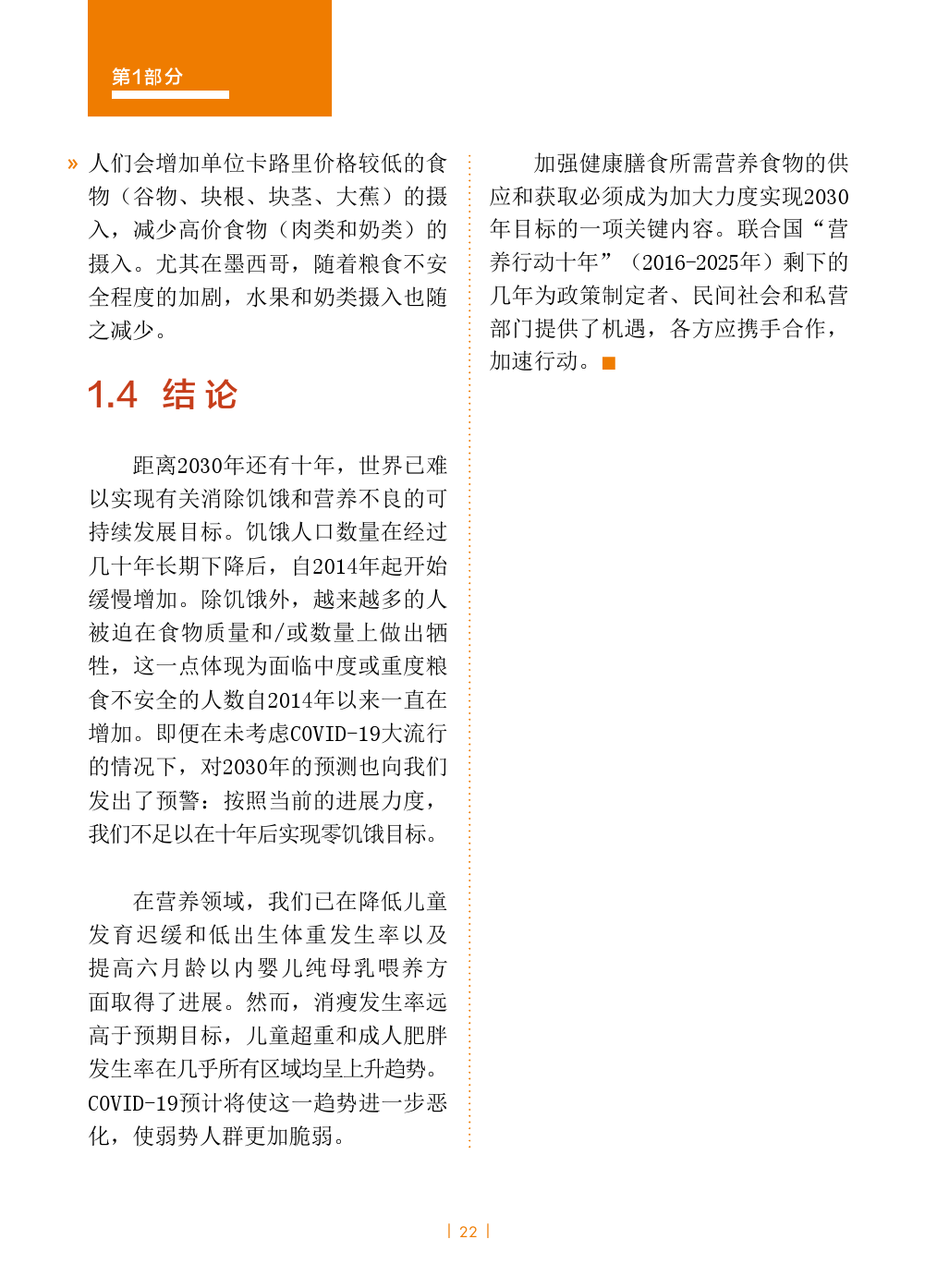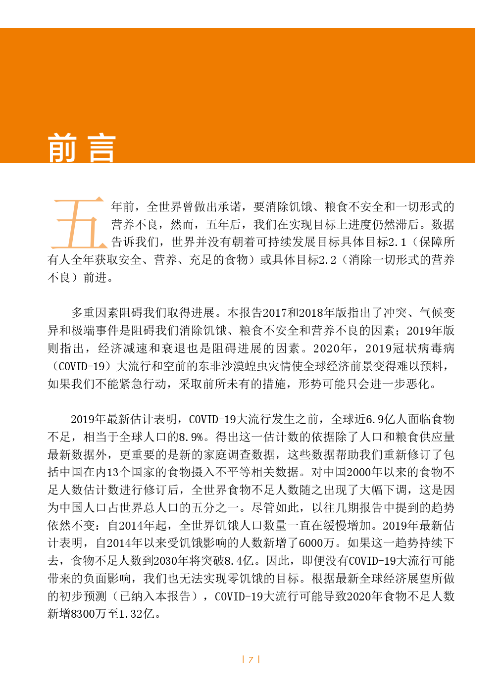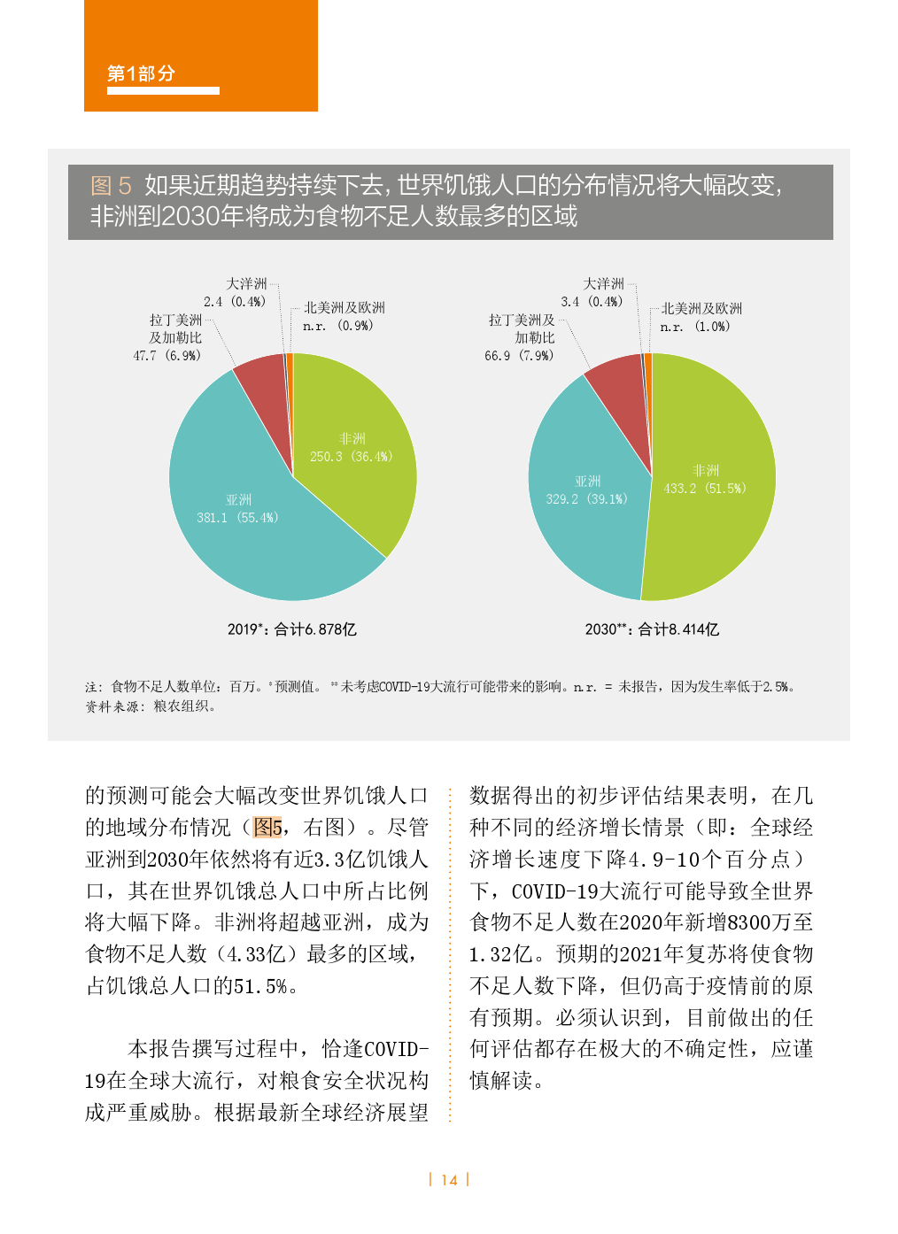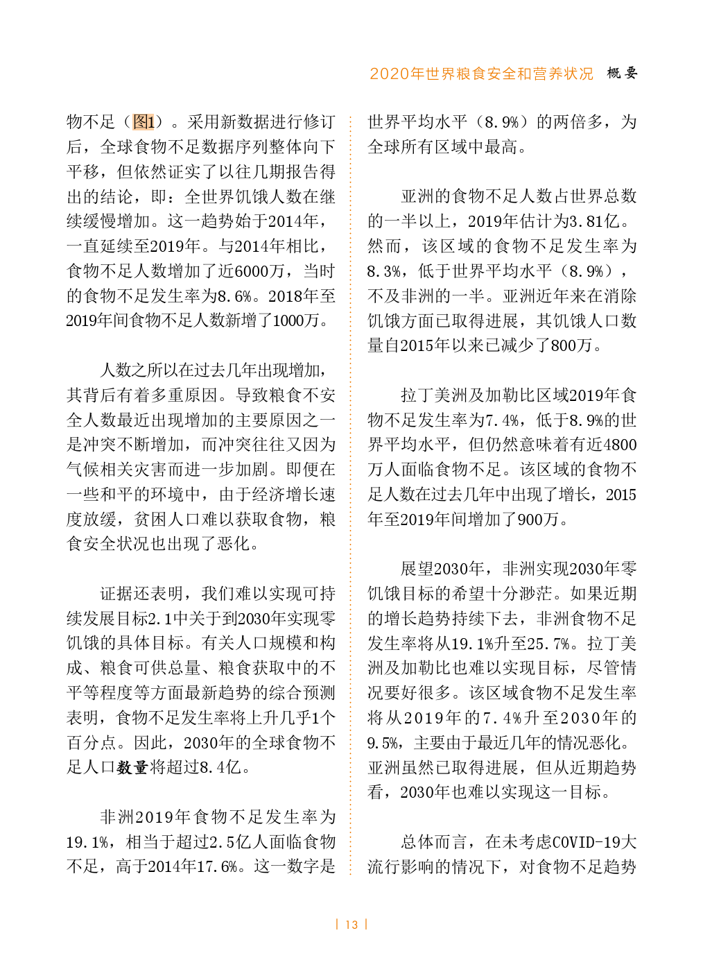 报告除了对粮食安全和营养状况进行常规评估外,还增加了在假设过去十年趋势持续不变的情况下,对 2030 年世界前景的预测。发布报告的五家机构负责人指出,距离在2030年实现零饥饿、结束粮食不安全状况及各种形式营养不良的目标仍然遥远。