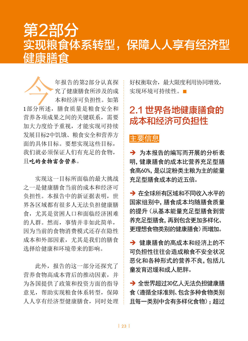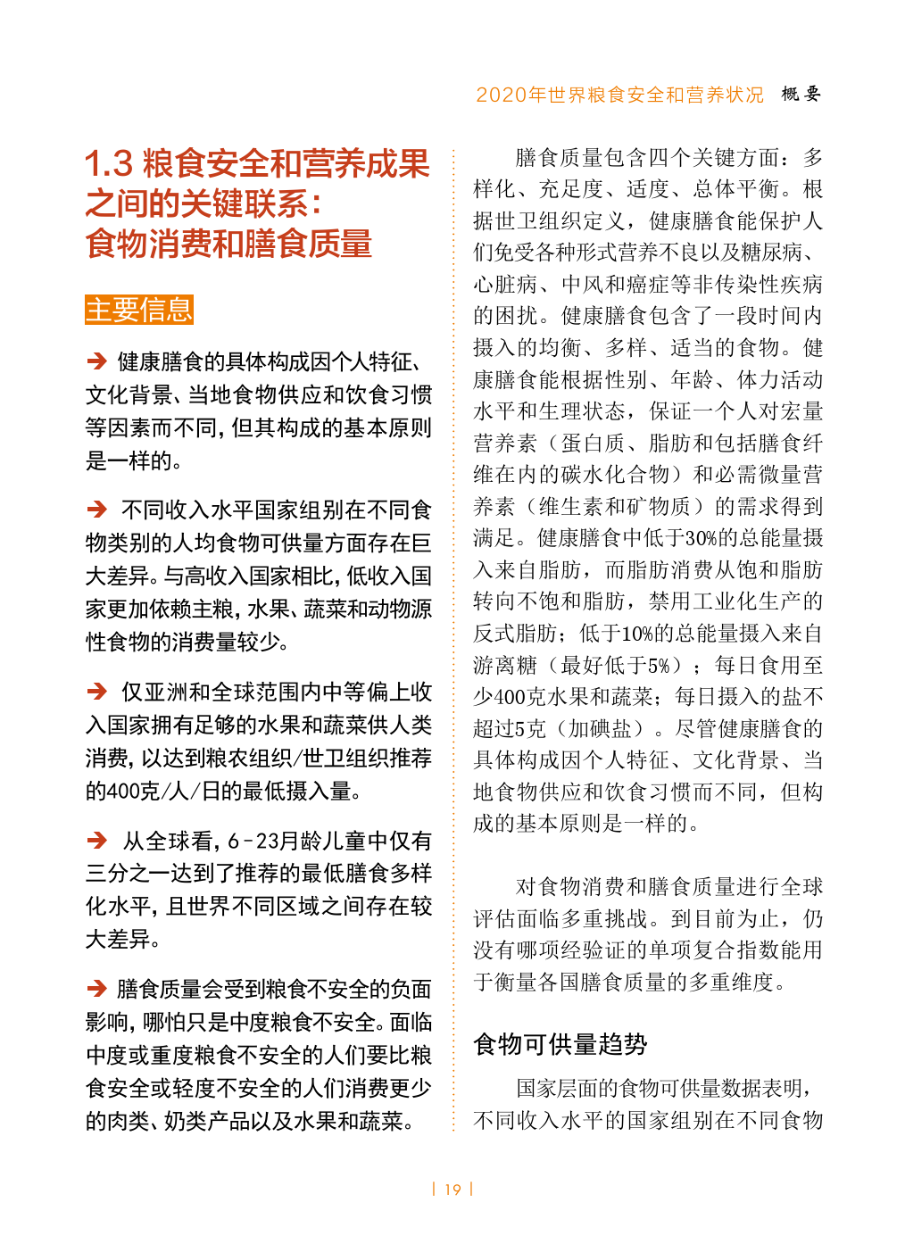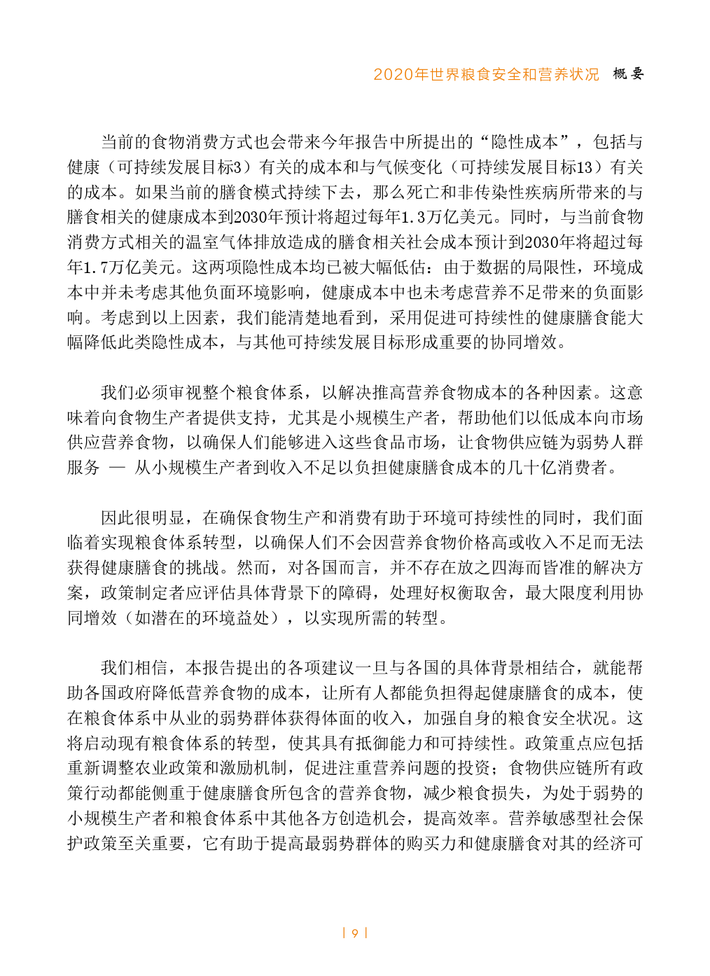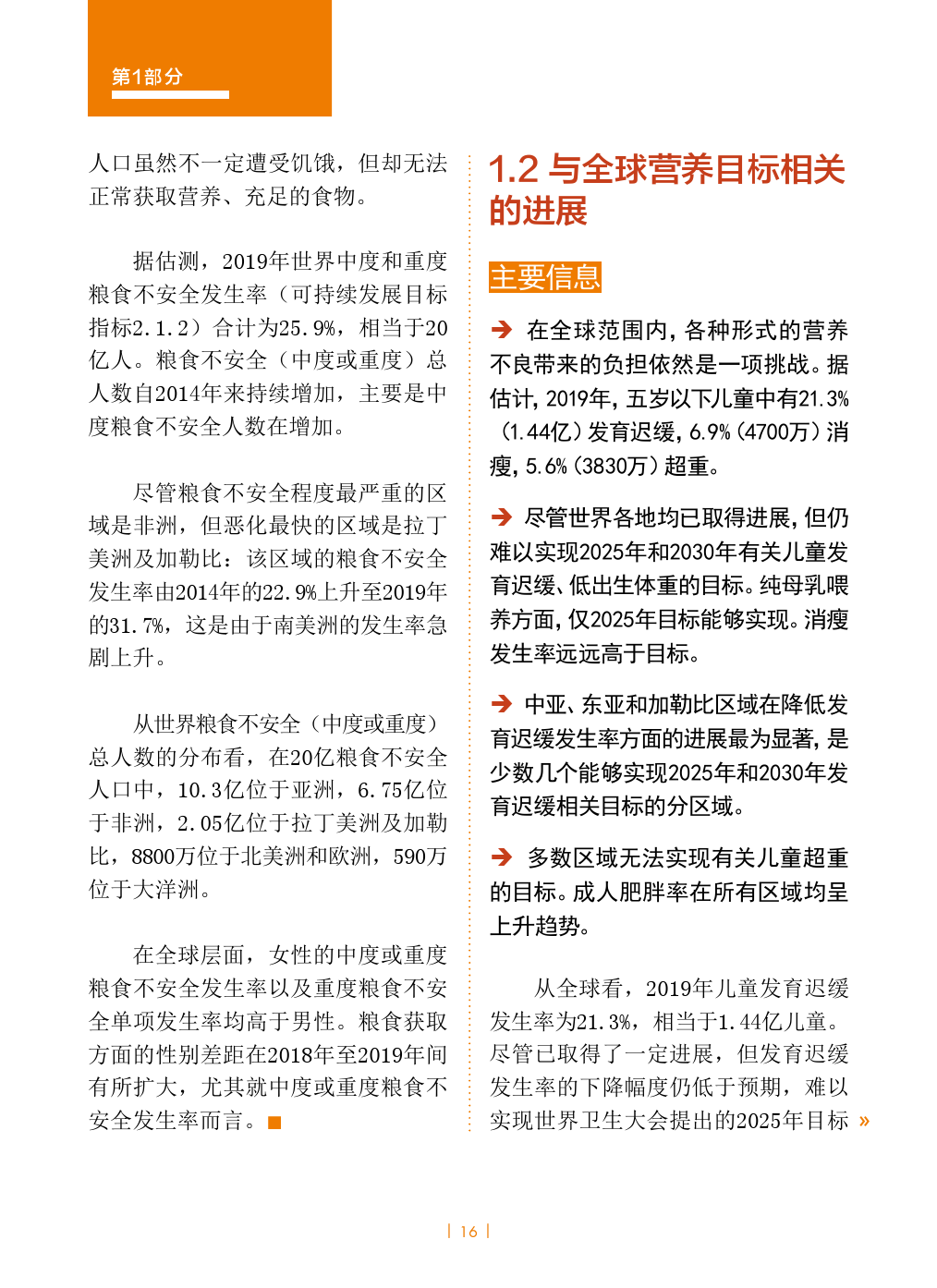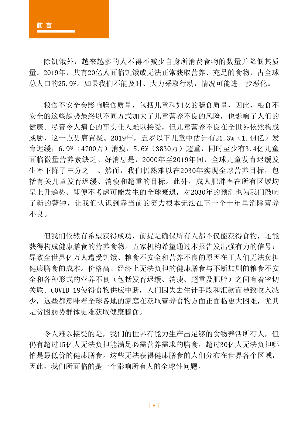 报告除了对粮食安全和营养状况进行常规评估外,还增加了在假设过去十年趋势持续不变的情况下,对 2030 年世界前景的预测。发布报告的五家机构负责人指出,距离在2030年实现零饥饿、结束粮食不安全状况及各种形式营养不良的目标仍然遥远。