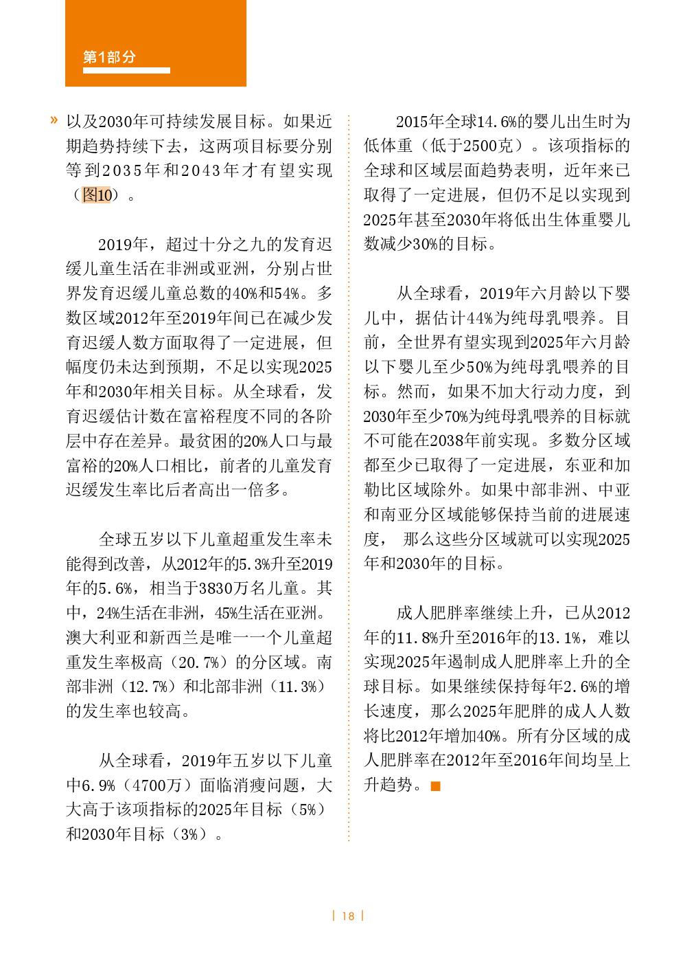 报告还显示,各种形式营养不良带来的负担依然是一项挑战。虽然在儿童发育迟缓、低出生体重和纯母乳喂养相关方面已取得一定进展,但进展速度依然过慢。在世界各地区,儿童超重问题尚未得到改善,成人肥胖问题则不断加重。