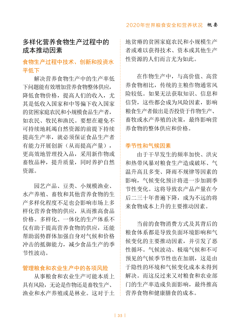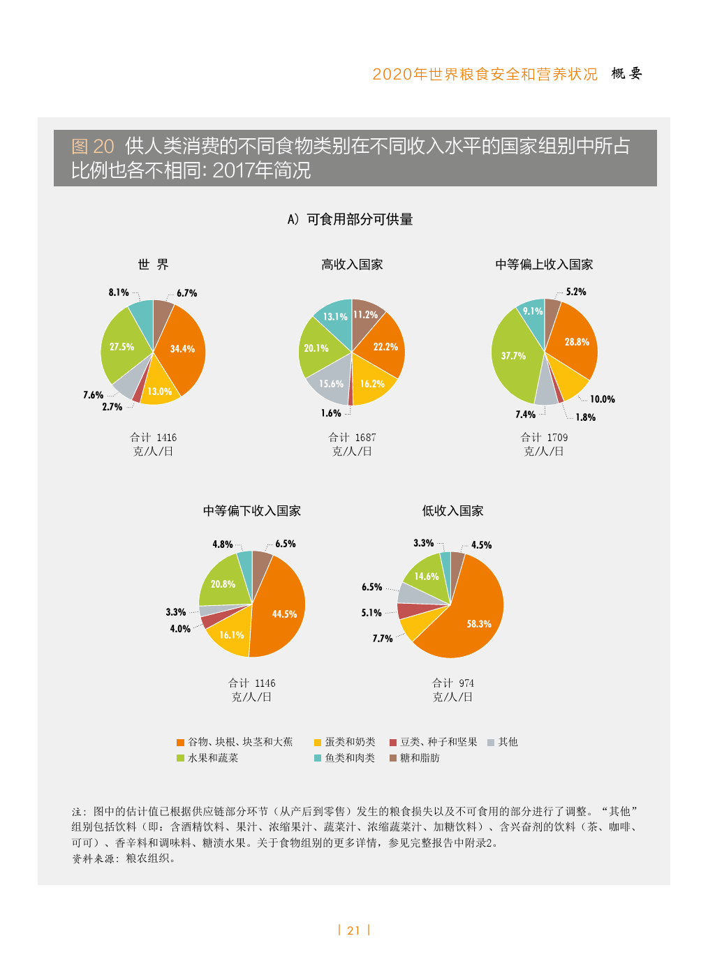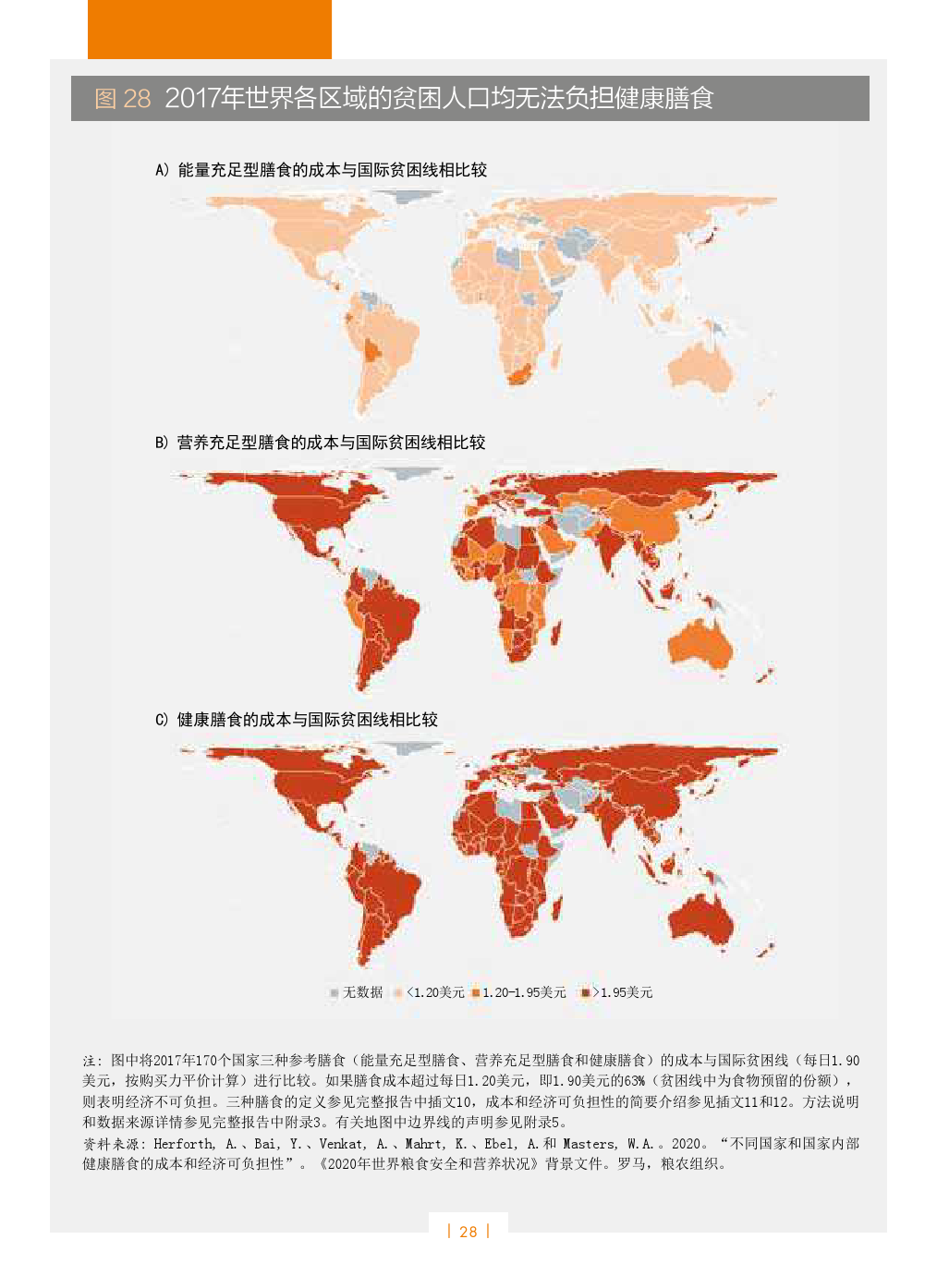 报告指出,由于新冠肺炎疫情对健康和社会经济造成影响,多数弱势群体的粮食安全和营养状况很可能进一步恶化。初步评估表明,2019新型冠状病毒大流行可能导致全世界食物不足人数在2020年新增8300万至1.32亿,具体取决于经济增长前景。