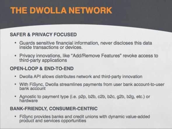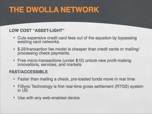 作为一个全新的在线移动支付平台,Dwolla 无需信用卡就能完成支付交易。因此,Dwolla 并不是另一个 PayPal,而是一个全新的具有颠覆性的支付工具。由于无需信用卡,用户也就无需支付高额的交易费,交易额无论多少,Dwolla 只从每笔交易中收取 25 美分的费用。