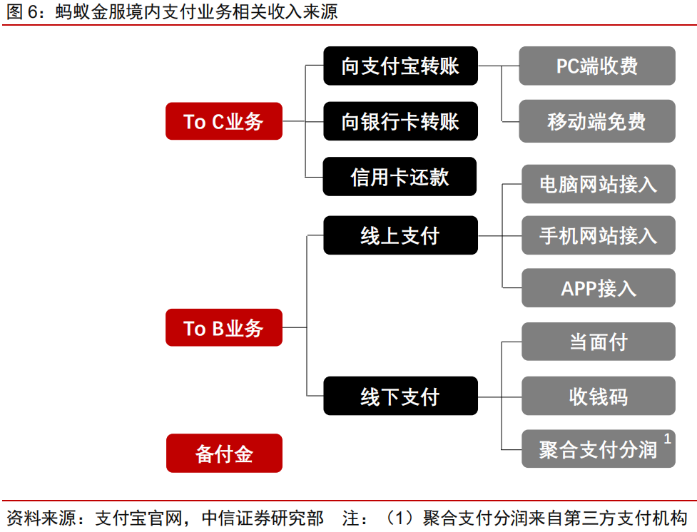 从估值看业务发展:三轮融资后,公司估值已在万亿量级。2015 年、2016 年、2018年,蚂蚁金服分别完成 A 轮(约 18.5 亿美元)/B 轮(约 45 亿美元)/C 轮(约 140 亿美元)融资。