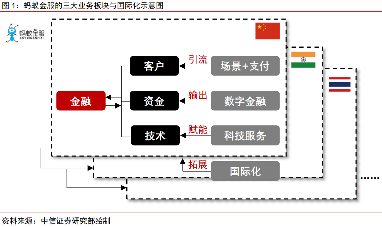 首先,从整体上来看,当前蚂蚁集团通过三大业务板块——支付&数字金融&科技服务——完美演绎了「能力输出」商业模式下的引流——变现——赋能逻辑。此外,公司借助国际化布局,将「能力输出」模式向海外复制。