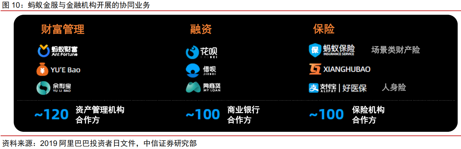 - 财富管理业务:借助蚂蚁财富(面向 C 端客户)、余利宝(面向 B 端客户)的平台,为资产管理机构引流,代销公募基金、理财型保险、信托产品、贵金属等全品类资管产品。目前,蚂蚁金服合作的外部资产管理机构数量超过 120 家。