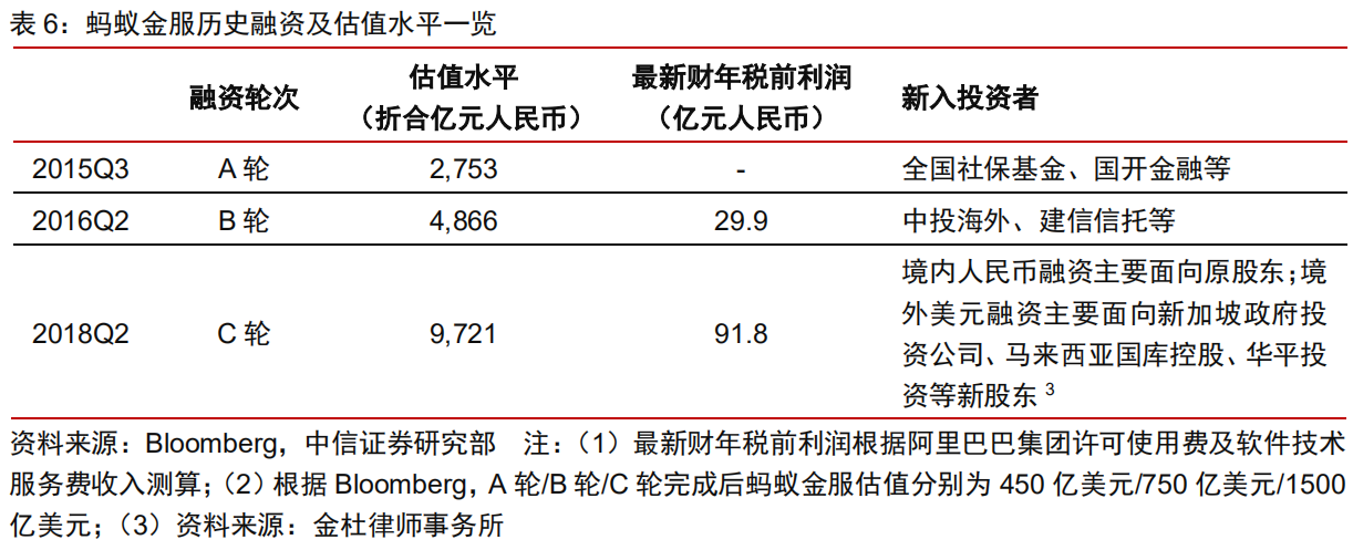 根据彭博报道,蚂蚁金服在 2018 年 6 月完成 C 轮融资后的估值水平约为 1500 亿美元,折合人民币约 9700 亿元。