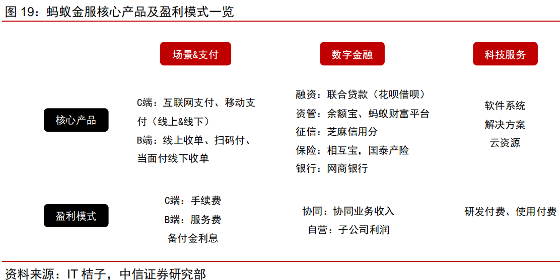 在互金领域强监管、金融机构数字化转型提速背景下,我们推测蚂蚁金服主动转型战略,弱化金融敞口,强化能力输出。对应数字金融业务,实现从经营资产负债表的「规模」策略,转型为经营利润表的「收入」策略。