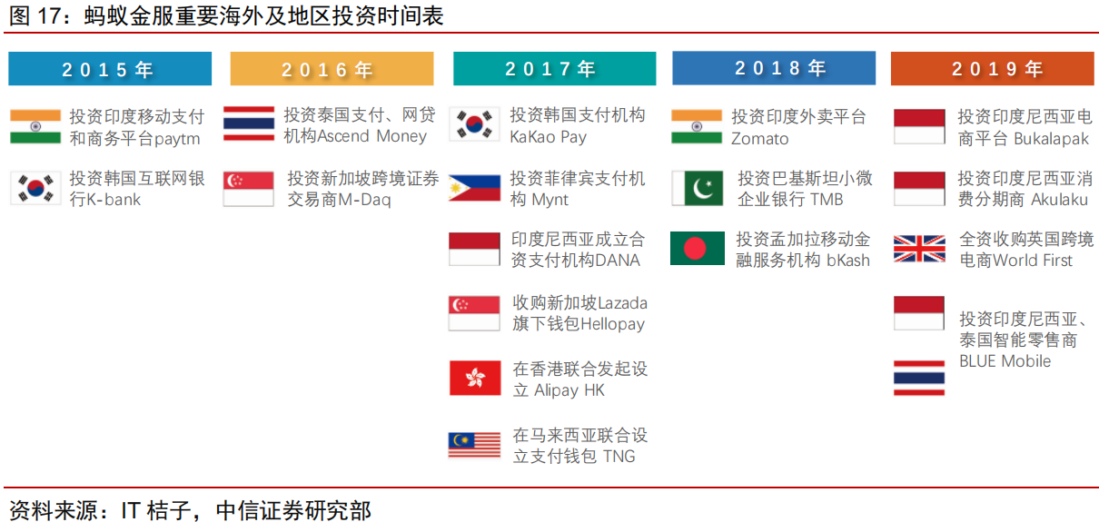 总体看,目前公司已经具备了跨境支付的技术基础、业务通路和牌照许可,未来蚂蚁金服有望依托本地电子钱包作为「节点」、跨境支付作为「通路」,构建全球范围的支付网络,进而组成全球范围的服务网络。