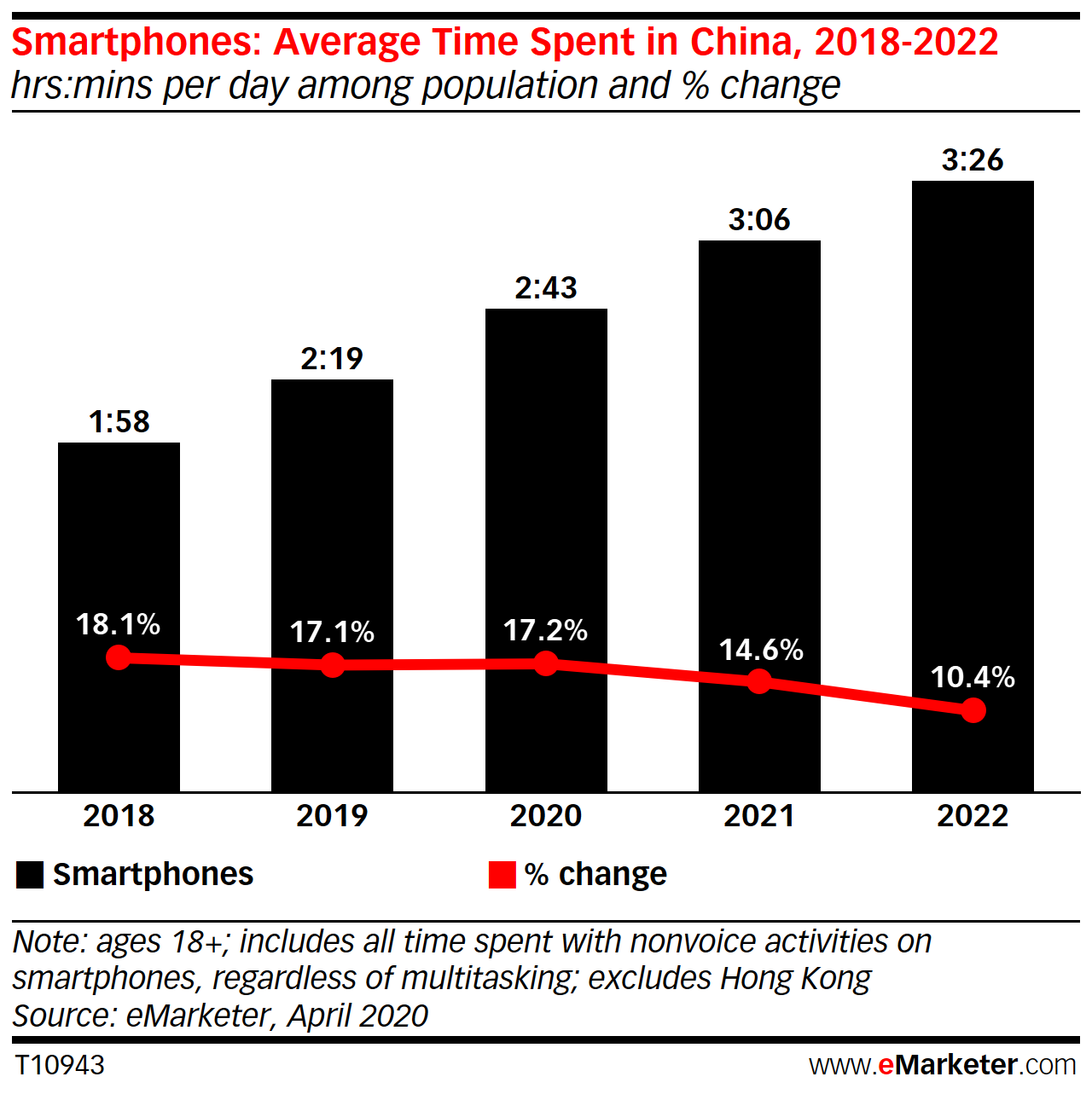 eMarketer预计,今年中国成年人平均每天花在智能手机上的时间为2小时43分钟,比2019年增长17.2%。此前eMarketer曾预测2020年中国智能手机使用量增长将放缓,但更新后的数字预测智能手机使用在2021年及以后将达到新的高度。