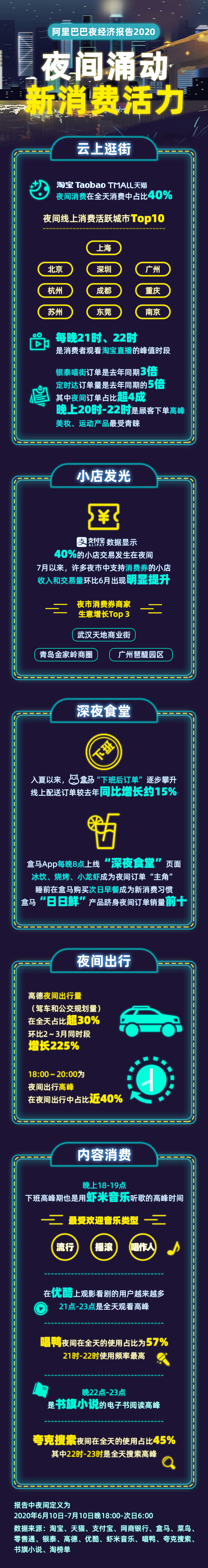 阿里巴巴夜经济报告显示,40%的小店交易发生在晚上6点到次日早上6点,截止目前,全国有600多万小店的夜间收入超过去年同期。