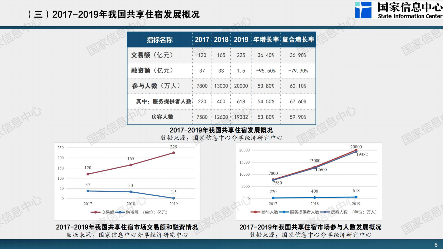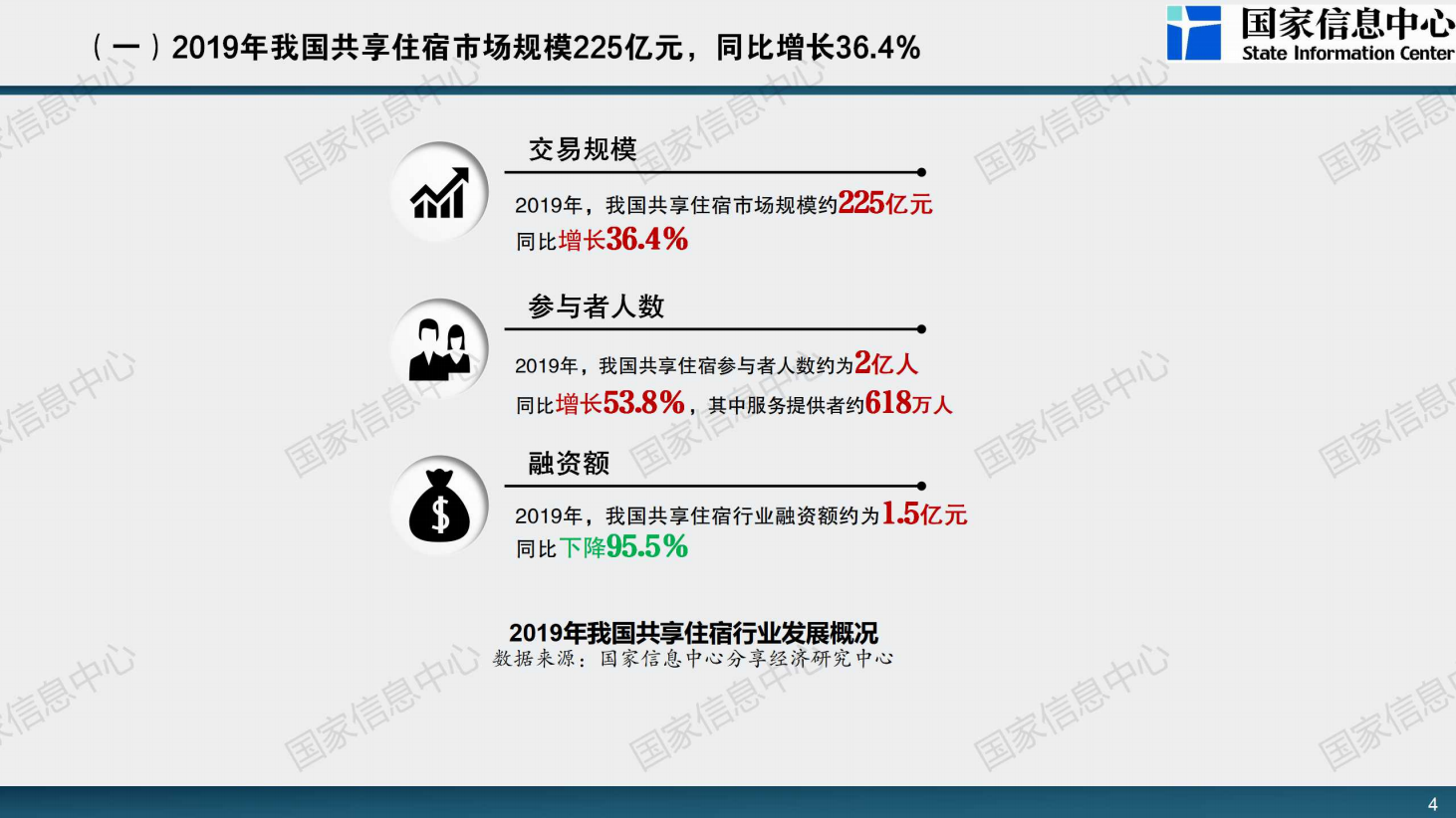 近日,国家信息中心分享经济研究中心发布《中国共享住宿发展报告2020》。报告显示,2019年,我国共享住宿行业的交易规模约为225亿元,同比增长36.4%。共享住宿行业的参与者人数约为2亿人,同比增长53.8%。其中,服务提供者人数约为618万人,同比增长54.5%,房客人数达到1.9亿人,较上年增长53.8%。