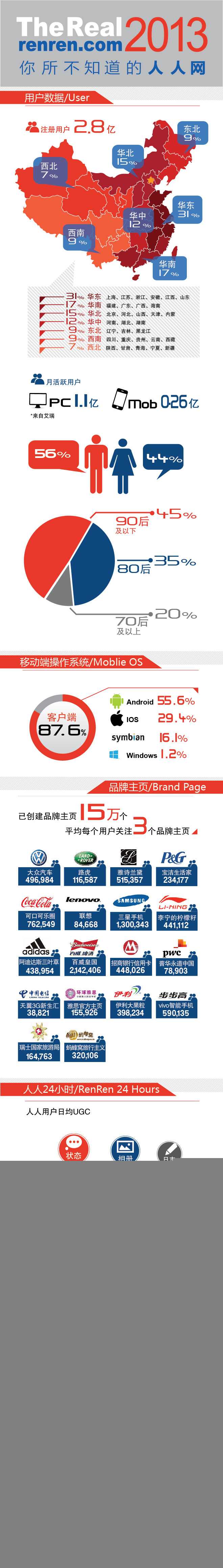 2013年人人网用户属性数据分析–数据信息图 人人网用户数据2013版,注册用户2.8亿。PC月活跃用户数为1.1亿,移动用户数0.26亿。90后占45%,带地理信息的原创内容日均170万条。 更多阅读:2011年淘宝母婴数据分析–数据信息图德勤:2013年社会化媒体和数字营销趋势–数据信息图eMarketer:中国网民喜欢玩微博Nielsen:中美社交网站大比较- 人人网VS facebookBBC :各界对于未来150 年的预测–数据信息图博客经济–数据信息图Mzinga:社会化商业带来衡量值–数据信息图Socially Aware:研究显示越来越多的人花越来越多的时间在社交网络上–数据信息图Social:预测2017年全球社交广告支出达110亿美元–数据信息图数字盘点2012年社交网络的那些事–数据信息图你不知道这样旅游很酷吗?–数据信息图2012年社交媒体发展盘点–数据信息图Socially Sorted:社交媒体走向“视觉化“–数据信息图社交网站知道你上网都干了些什么?–数据信息图社交网络的发展史–数据信息图