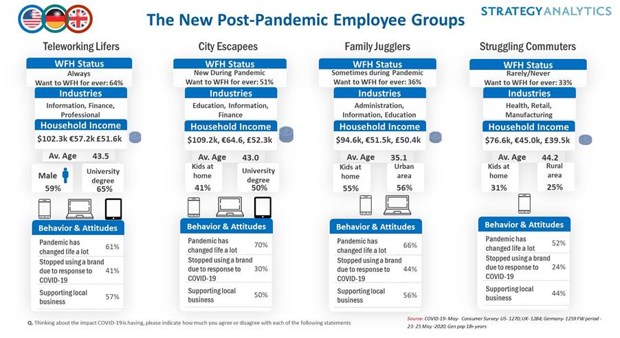 Strategy Analytics最新发布的研究报告指出,大量员工的在家办公将减少数十亿的通勤路程,并使基于办公室的工作环境减少22%。该分析基于后疫情时代就业环境中四个雇员群体的出现: