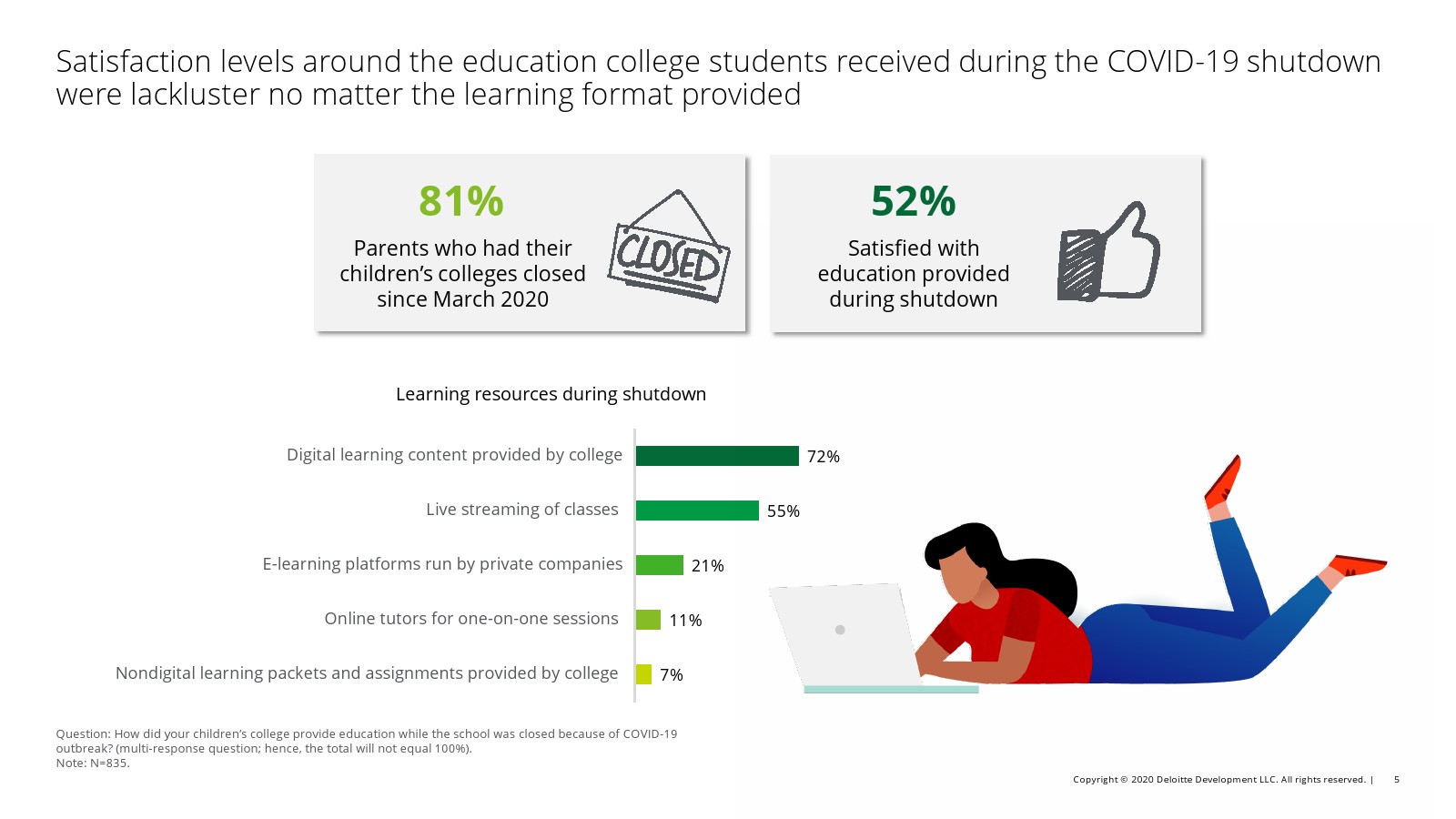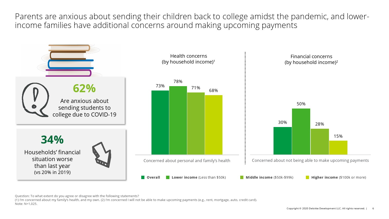因新冠肺炎的影响,只有52%的家长对学生今年春天接受的教育感到满意。与此同时,62%的家长对送孩子上大学感到焦虑,40%的家长担心即将到来的与大学相关的付款。