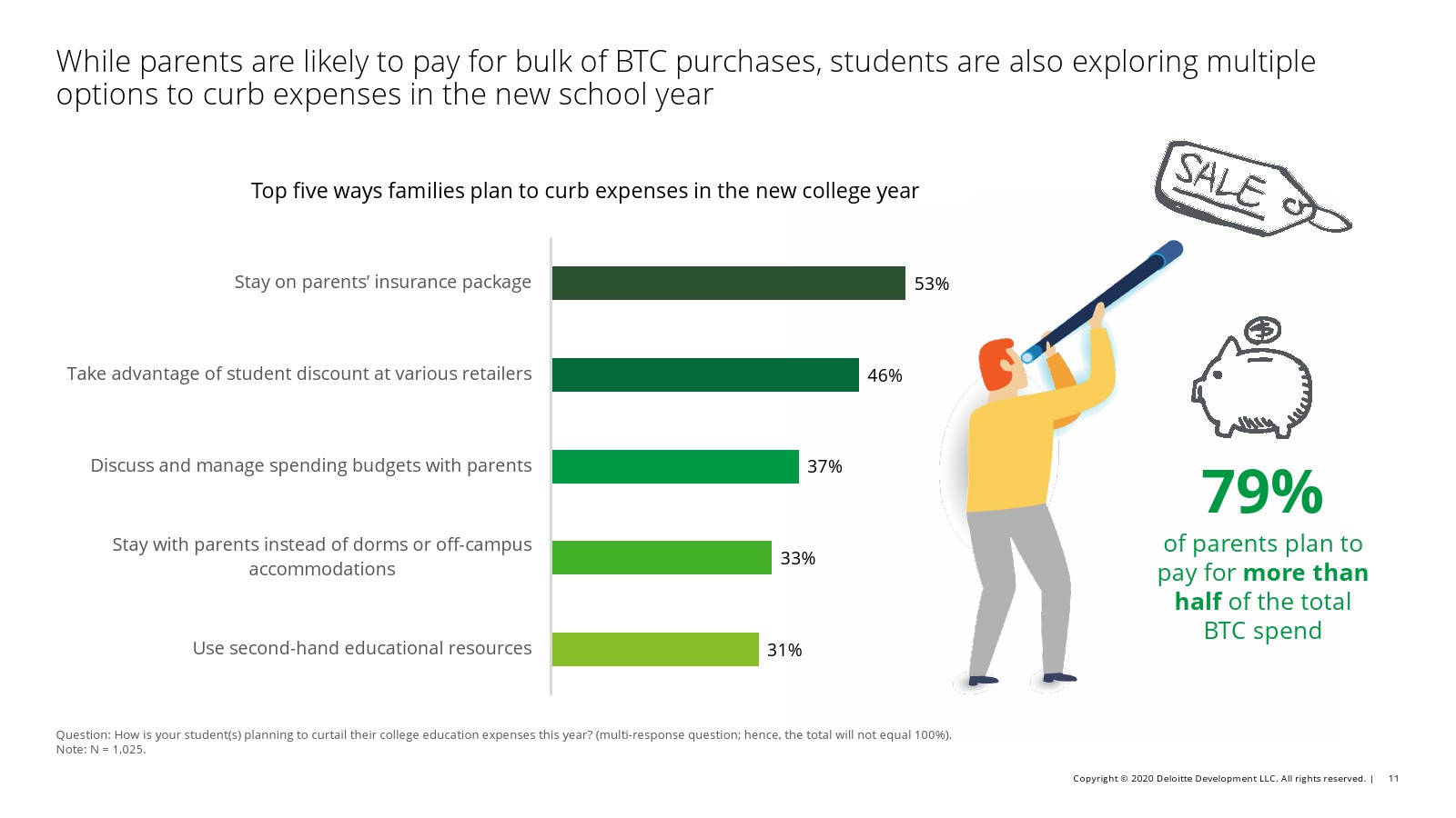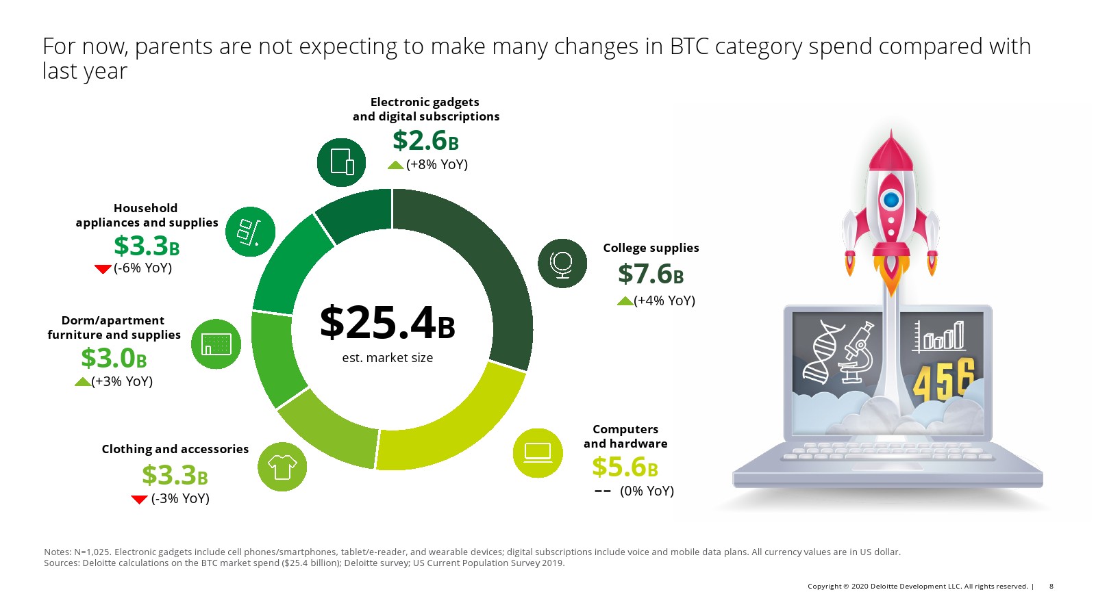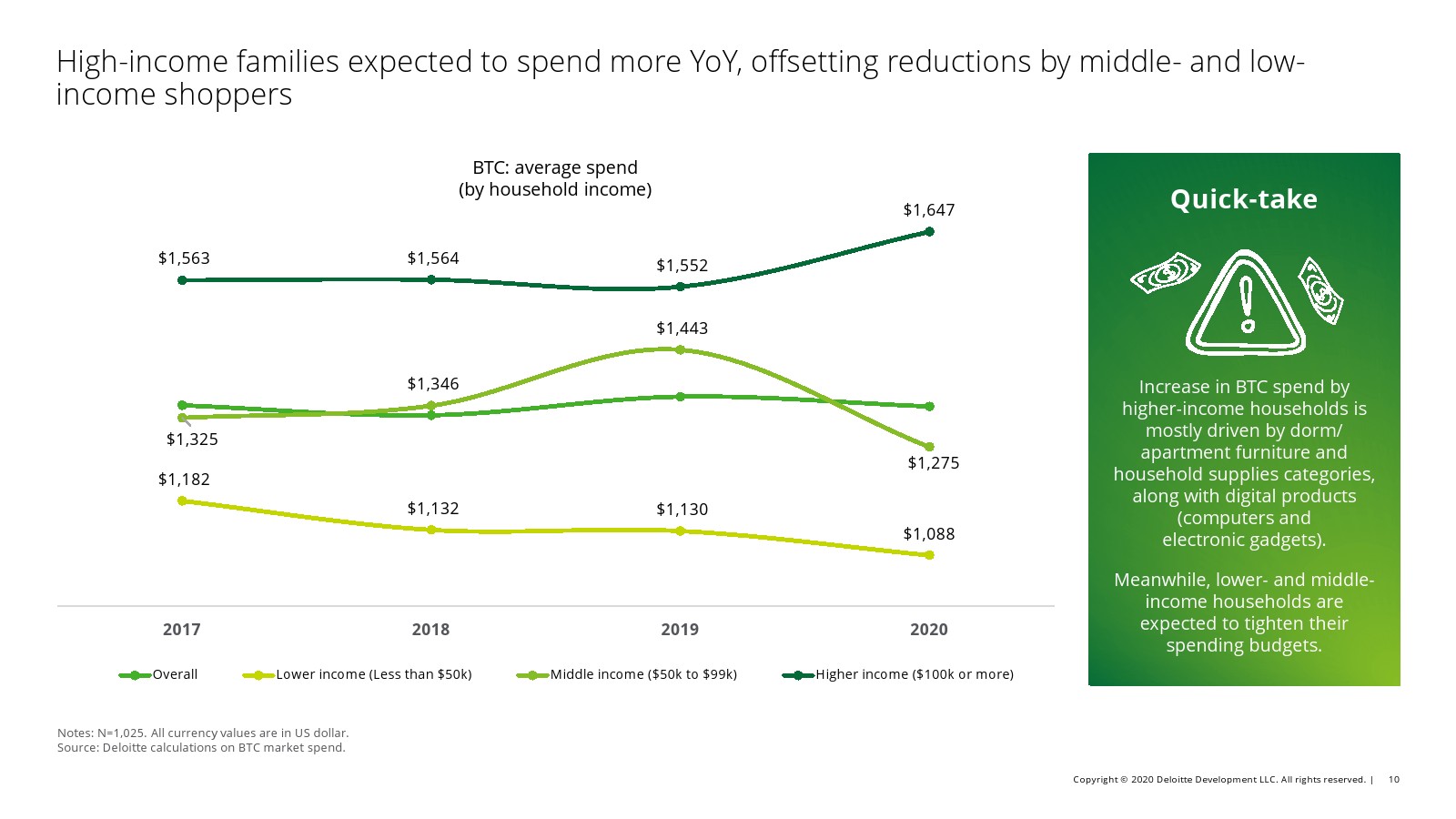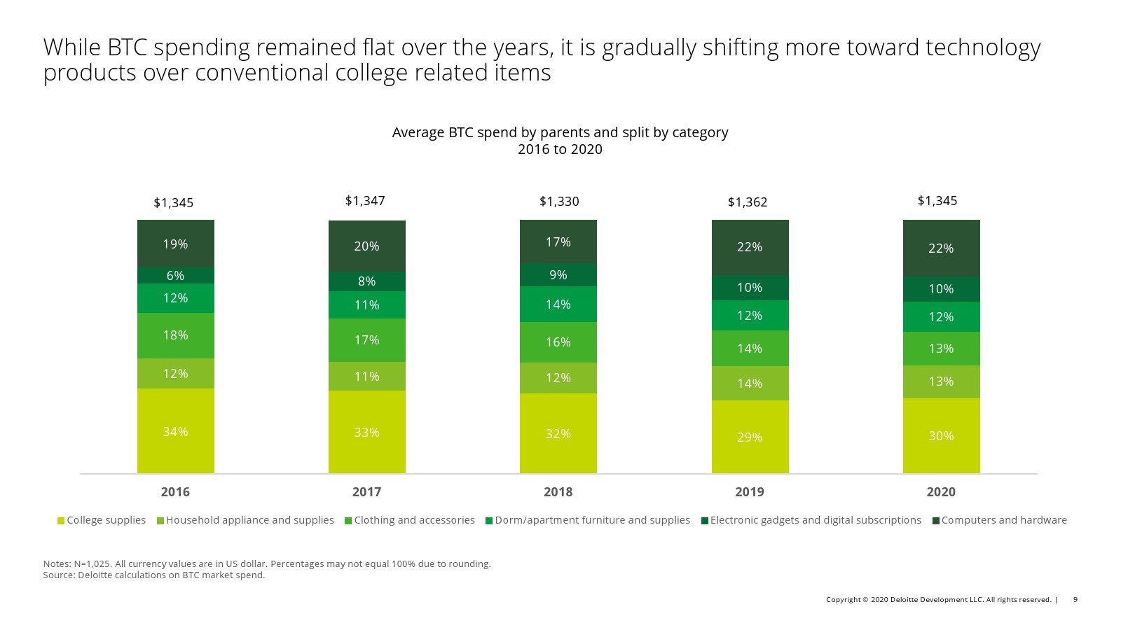 - 父母预计重返大学(BTC)的平均支出为1345美元,但在不同群体中支出出现分歧:高收入人群增长6%,而中低收入人群分别下降12%和4%。