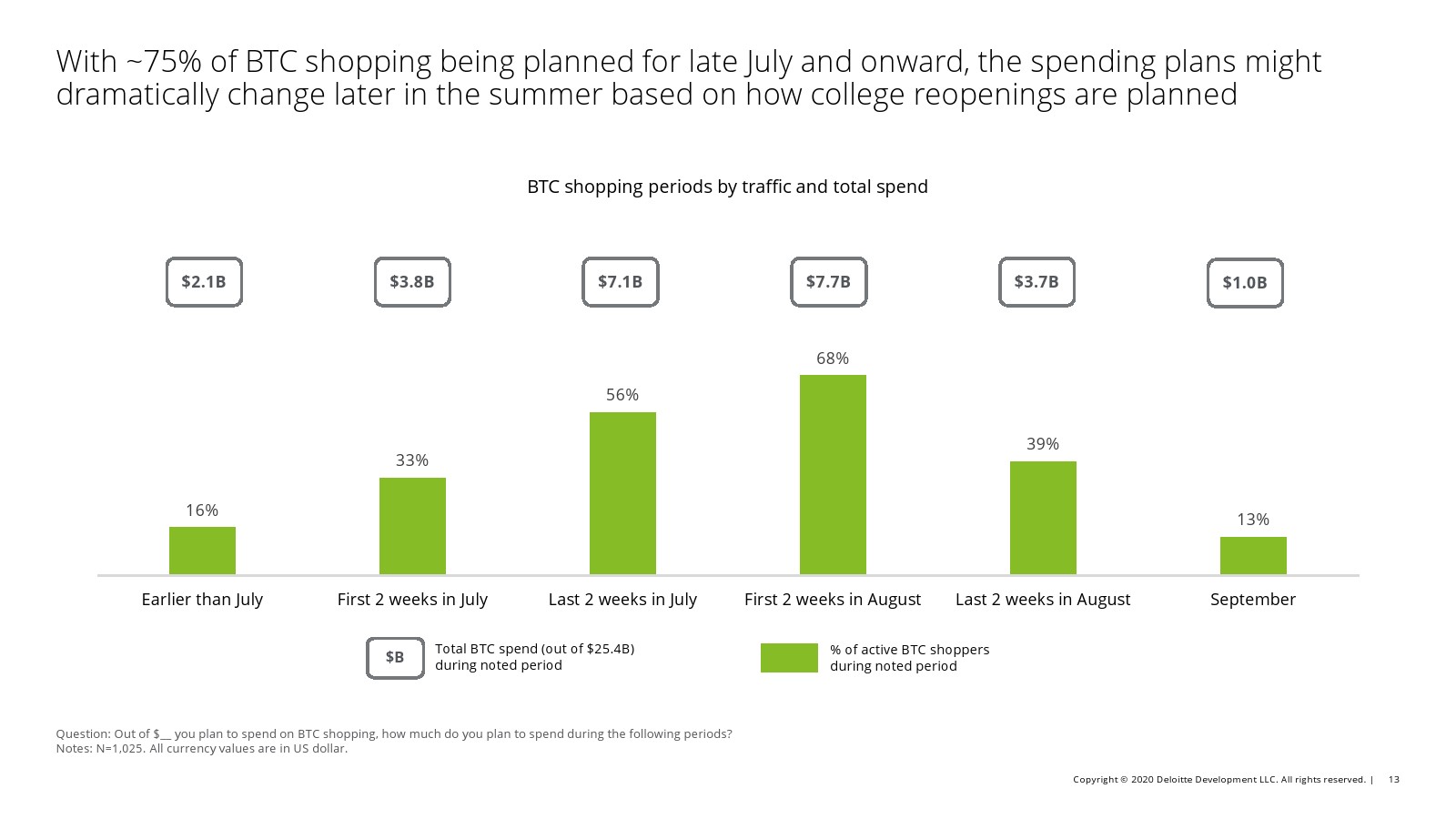 - 由于大约75%的BTC支出是从7月下旬开始计划的,根据大学重新开放的计划,支出计划可能会在夏季晚些时候发生重大变化。