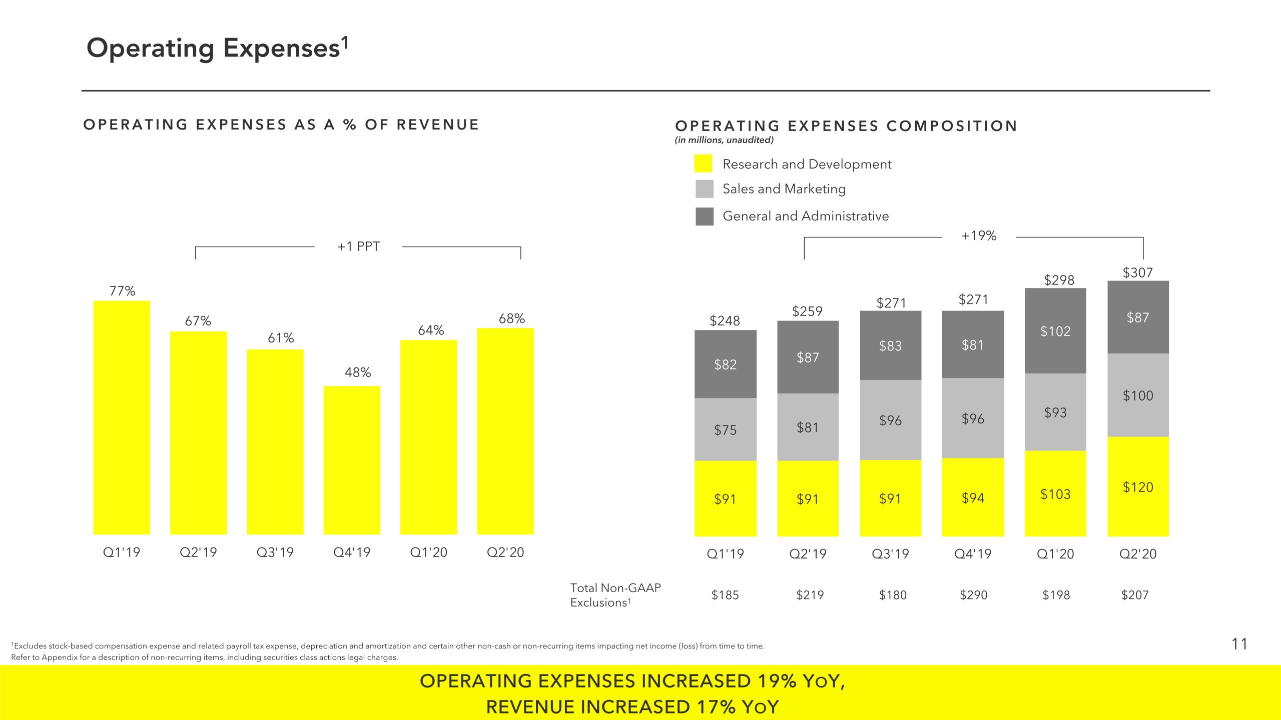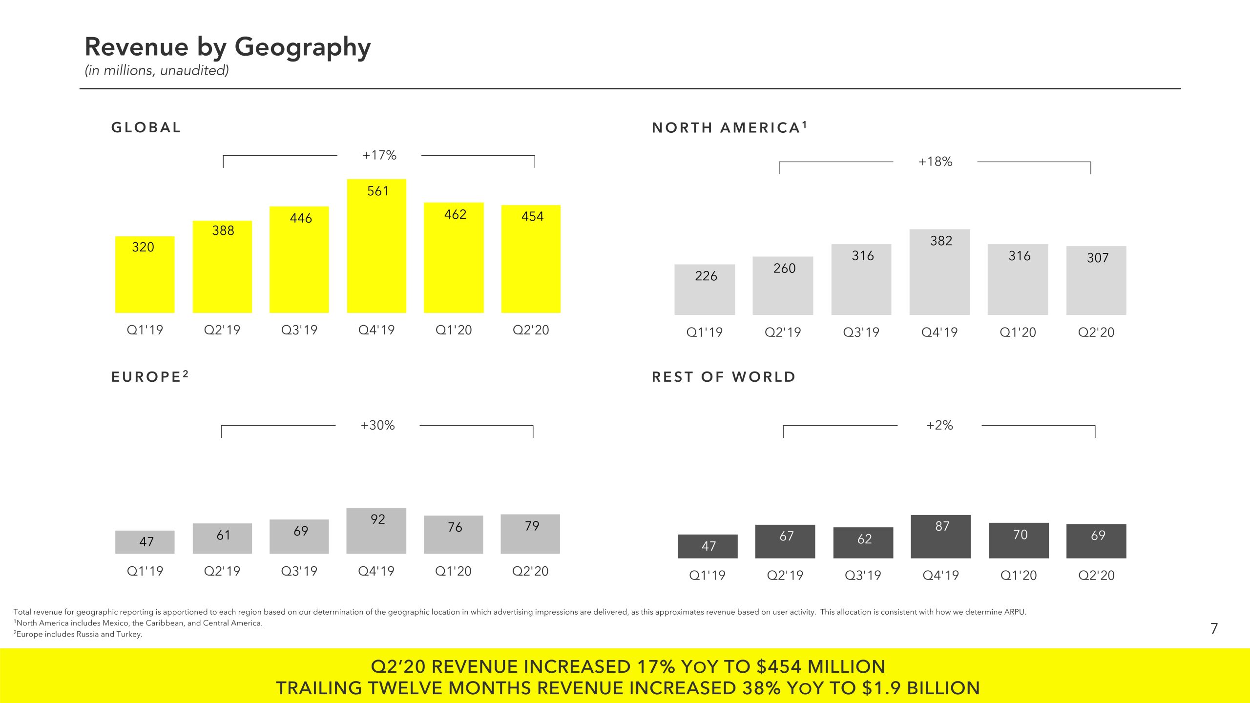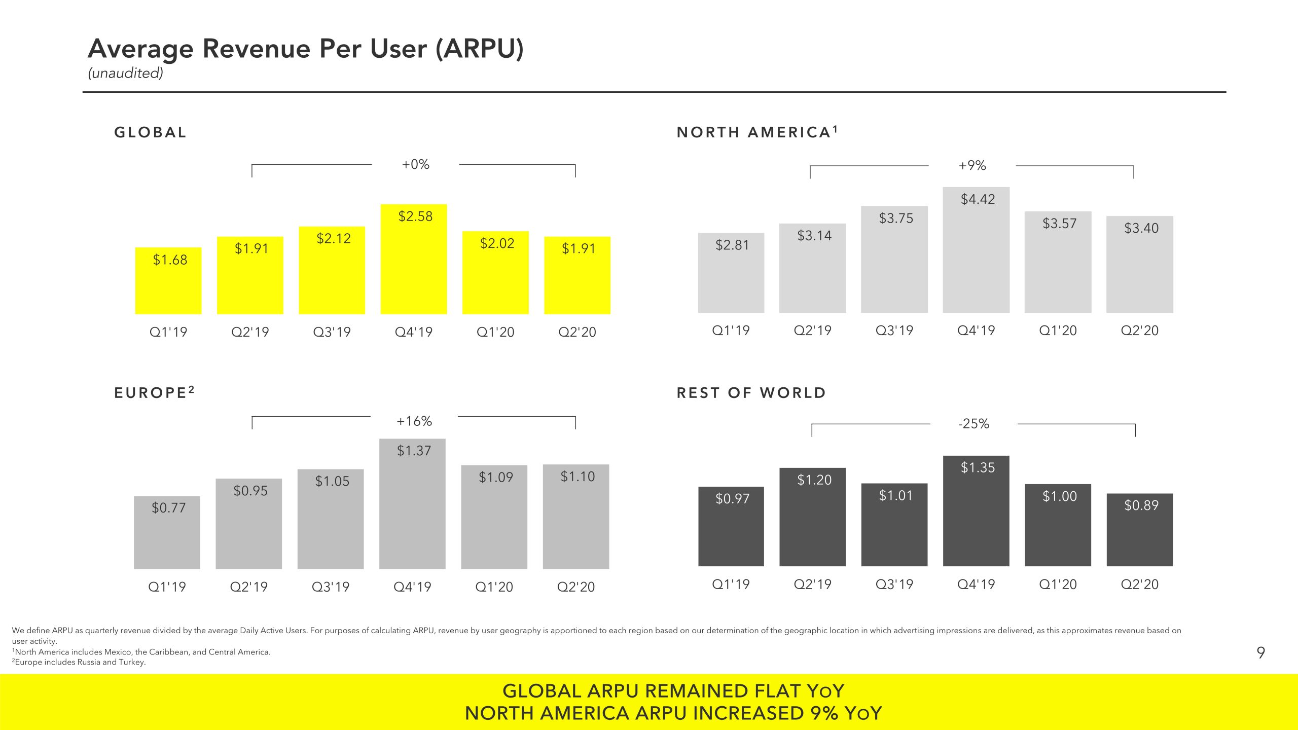 2Q20 Snap营收同比增长17%至4.54亿美元,人均变现水平为1.91美元,同比持平。