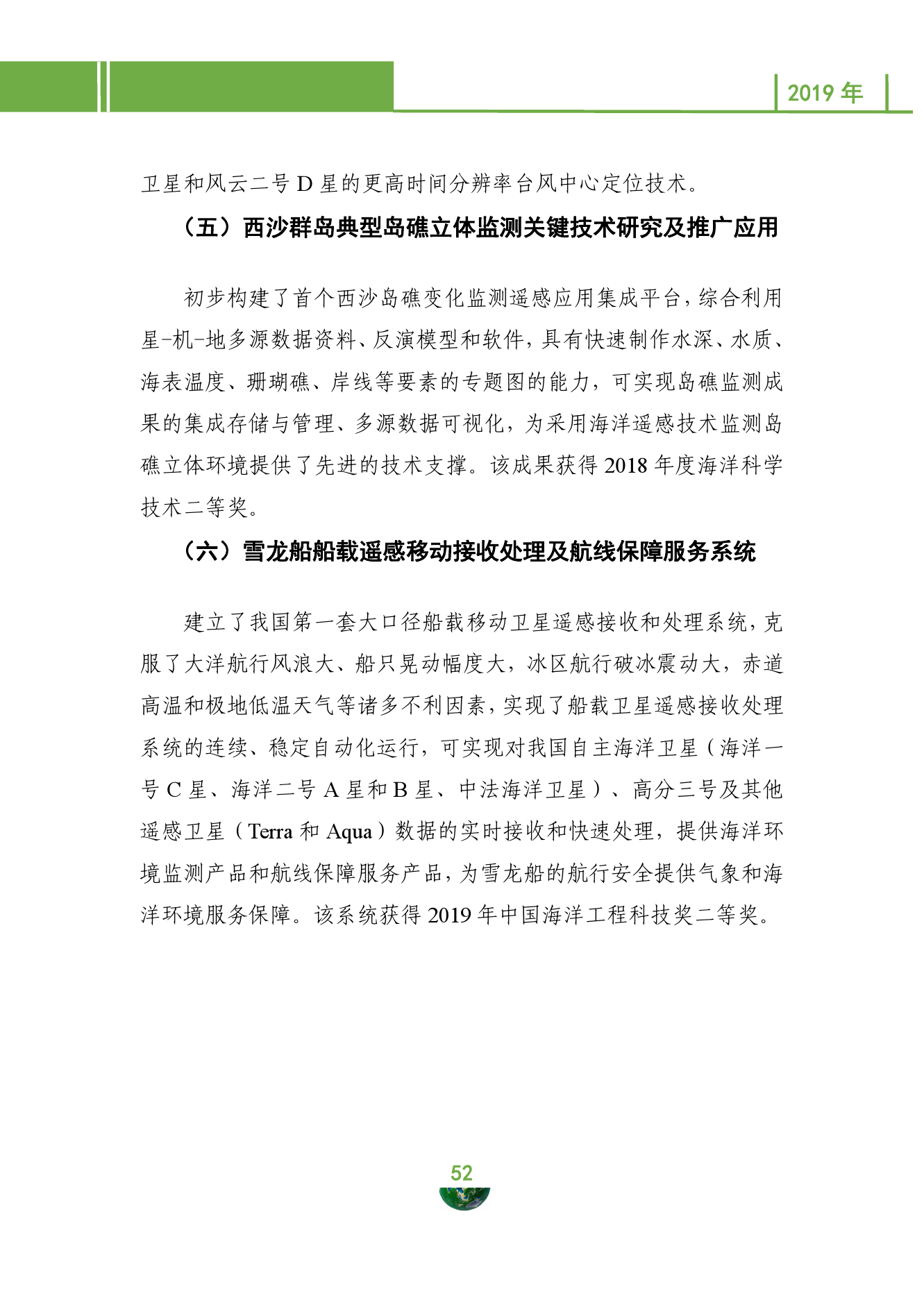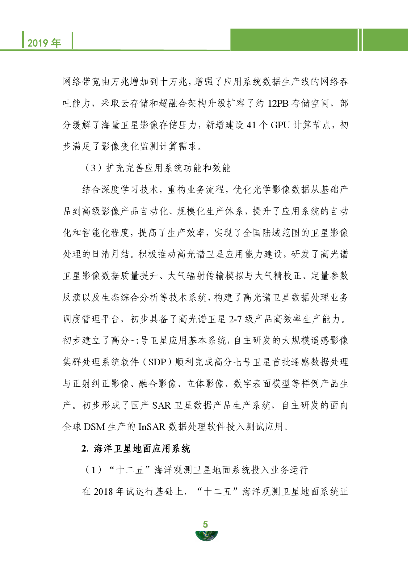 在持续推进卫星观测体系和业务应用体系建设方面,成功发射5米光学业务卫星和高分七号两颗陆地遥感卫星,形成高光谱业务和亚米级立体卫星遥感观测能力,在轨陆地卫星数量增加到10颗,高光谱数据整体获取能力提升50%,立体观测能力实现从1∶5万到1∶1万的跨越。海洋一号C卫星、海洋二号B卫星和中法海洋卫星3颗卫星正式交付投入业务化运行,形成了业务和科研相结合的卫星骨干网。