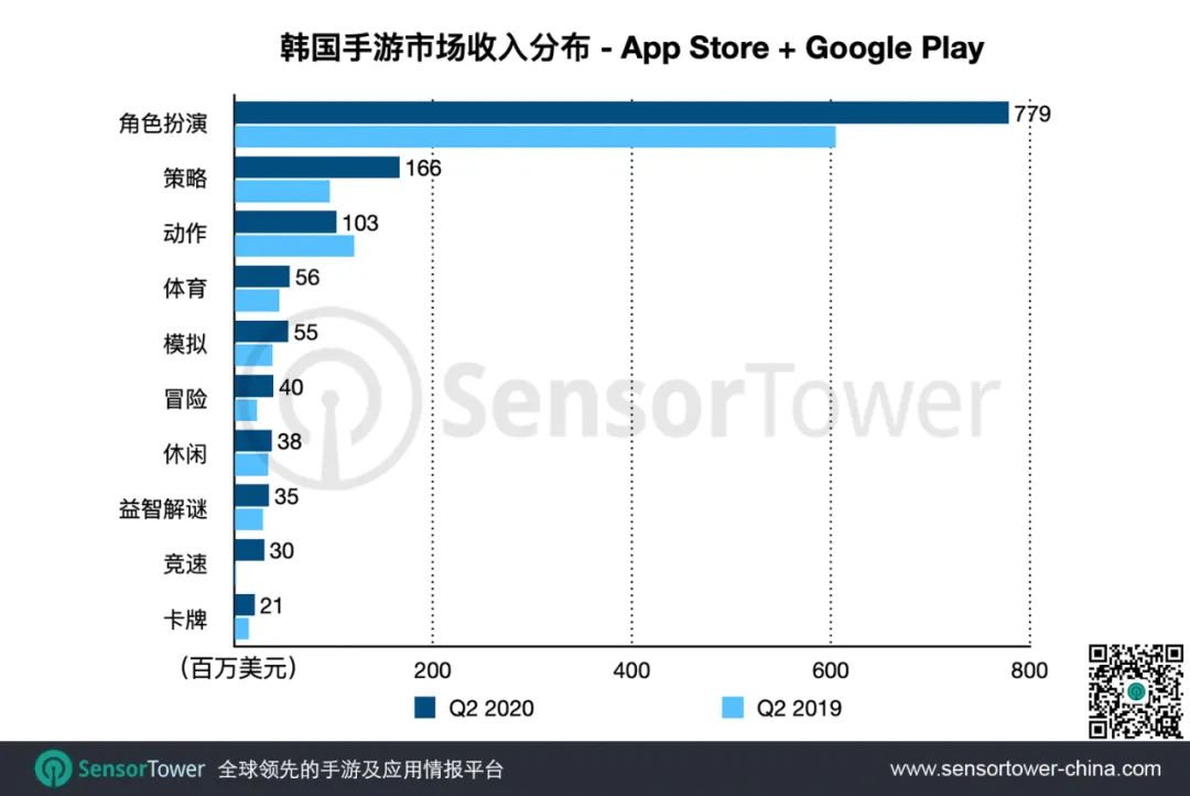虽然疫情高峰已过,韩国手游市场收入仍远高于去年同期。2020年Q2韩国Google Play和App Store手游总收入超过11.9亿美元,同比上涨23.8%。其中,来自App Store的收入占17.6%,Google Play占82.4%。