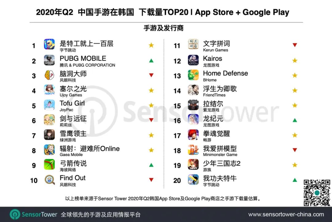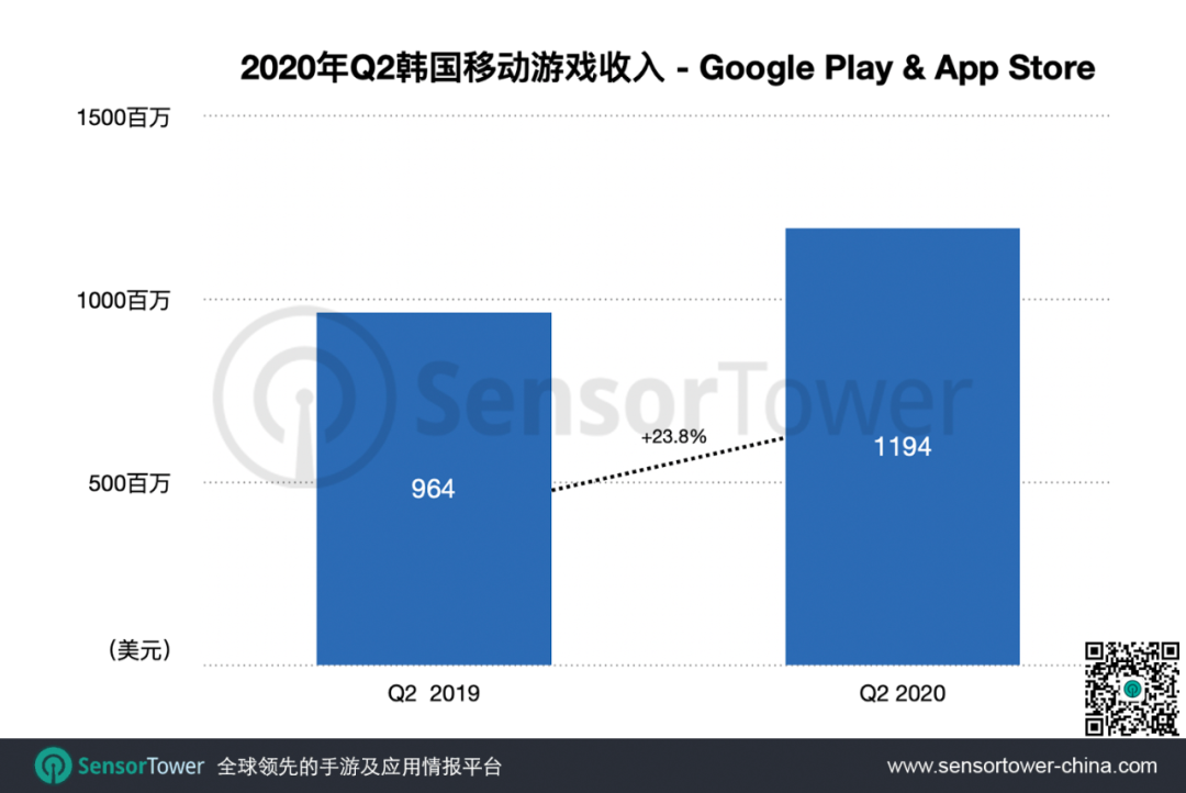Sensor Tower 商店情报最新数据显示,2020年Q2韩国手游市场收入超过11.9亿美元,同比增长23.8%。Q2中国手游对韩国市场发起新一轮猛攻,共39款产品入围韩国手游畅销榜Top100,为近年来最高。详细数据如下。