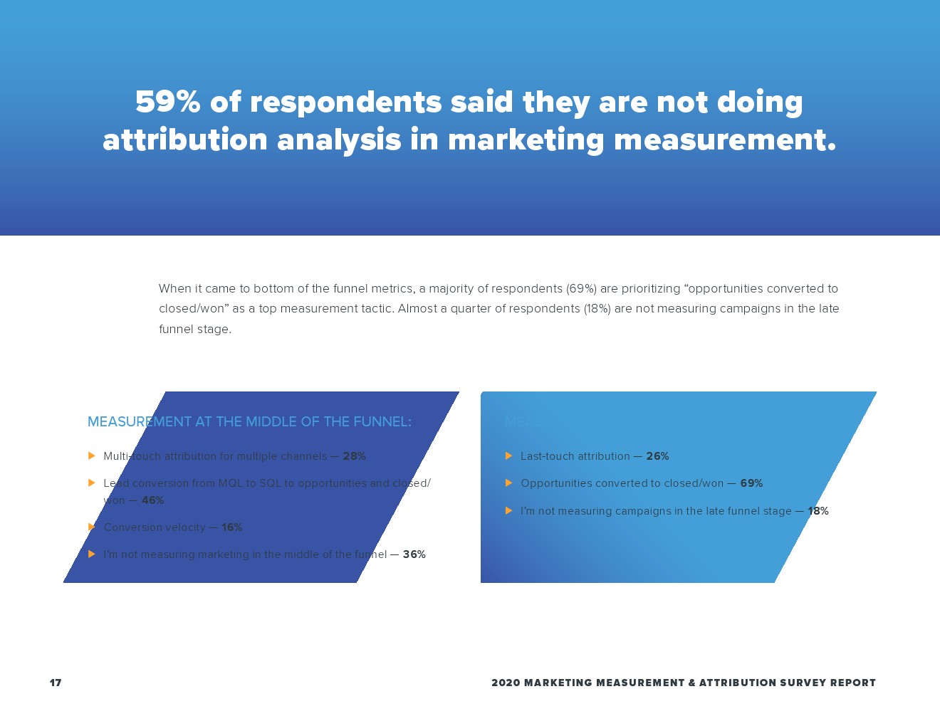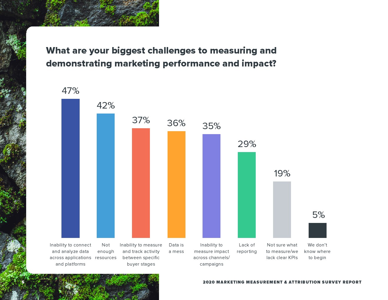 最常提到的挑战是无法跨应用和平台连接和分析数据,近一半(47%)的受访者体验到了这一点。紧随其后的是缺乏资源(42%),其次是无法测量和跟踪特定阶段的活动(37%)。