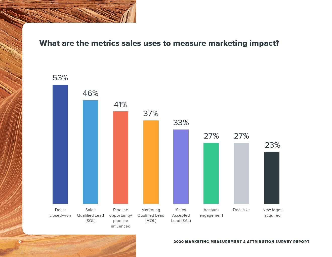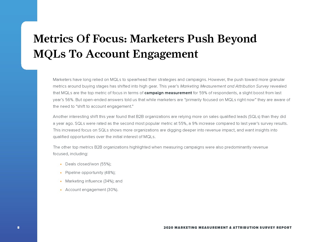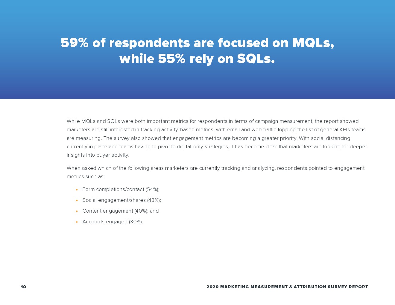 合格的营销线索(MQL)是营销人员活动测量的主要焦点(59%),而这在销售额方面排名第四(37%)。尽管如此,这份报告突显了营销人员越来越希望关注客户参与度,大多数的营销人员(55%)将成交作为首选指标,也是销售团队(53%)时用的最多的指标。