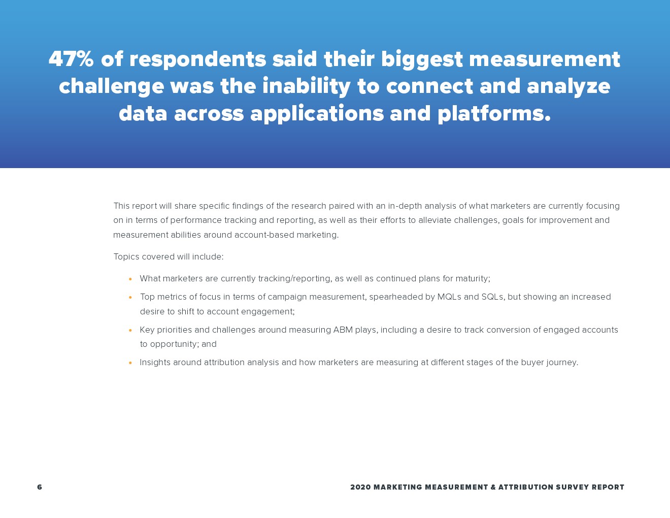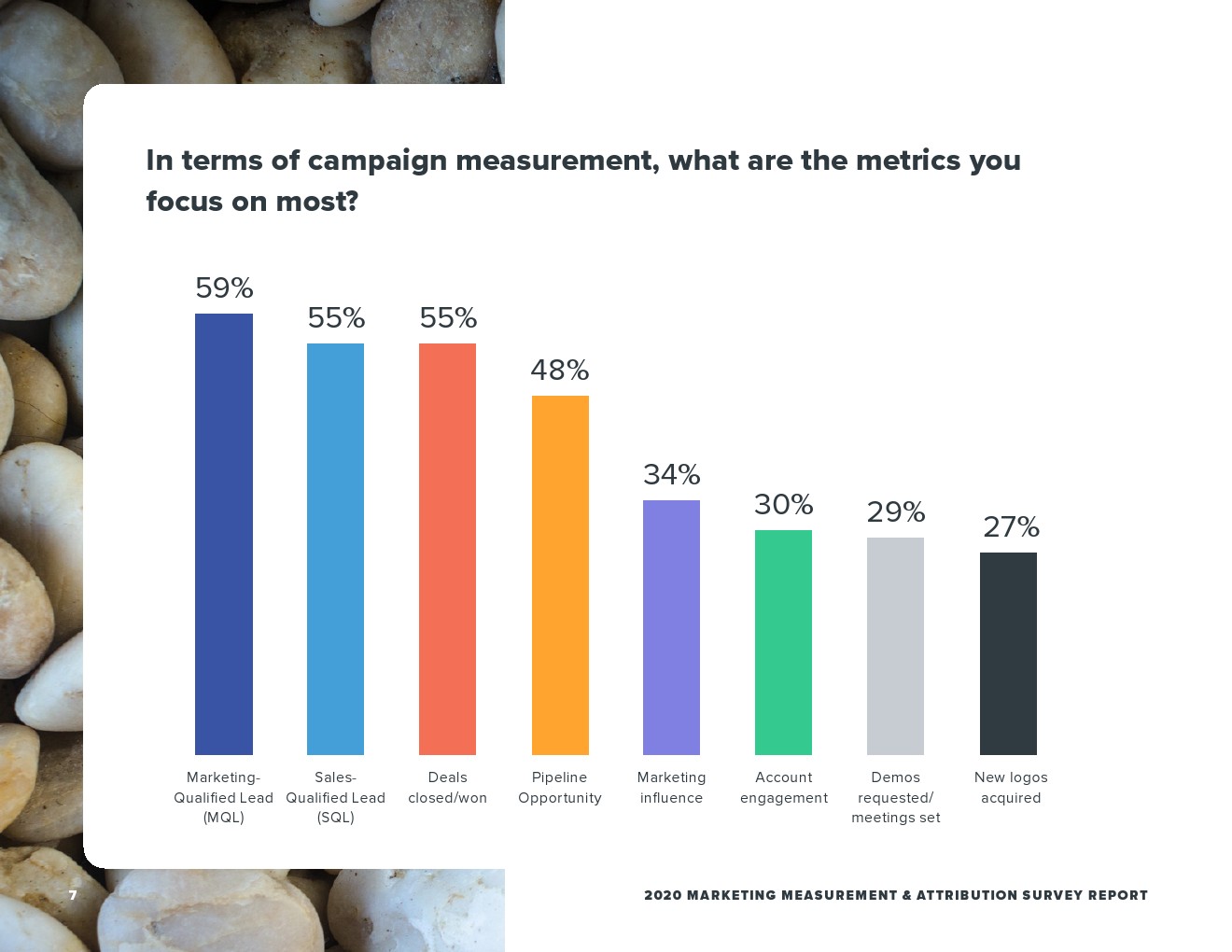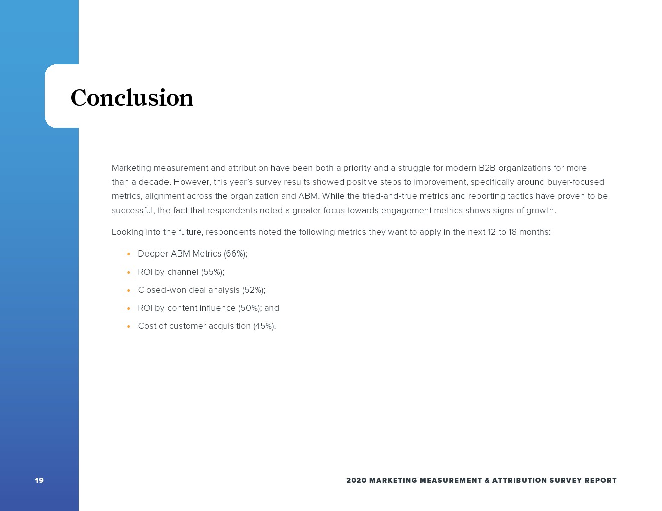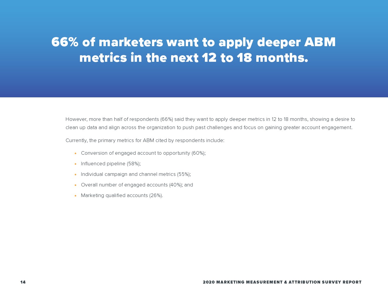 合格的营销线索(MQL)是营销人员活动测量的主要焦点(59%),而这在销售额方面排名第四(37%)。尽管如此,这份报告突显了营销人员越来越希望关注客户参与度,大多数的营销人员(55%)将成交作为首选指标,也是销售团队(53%)时用的最多的指标。