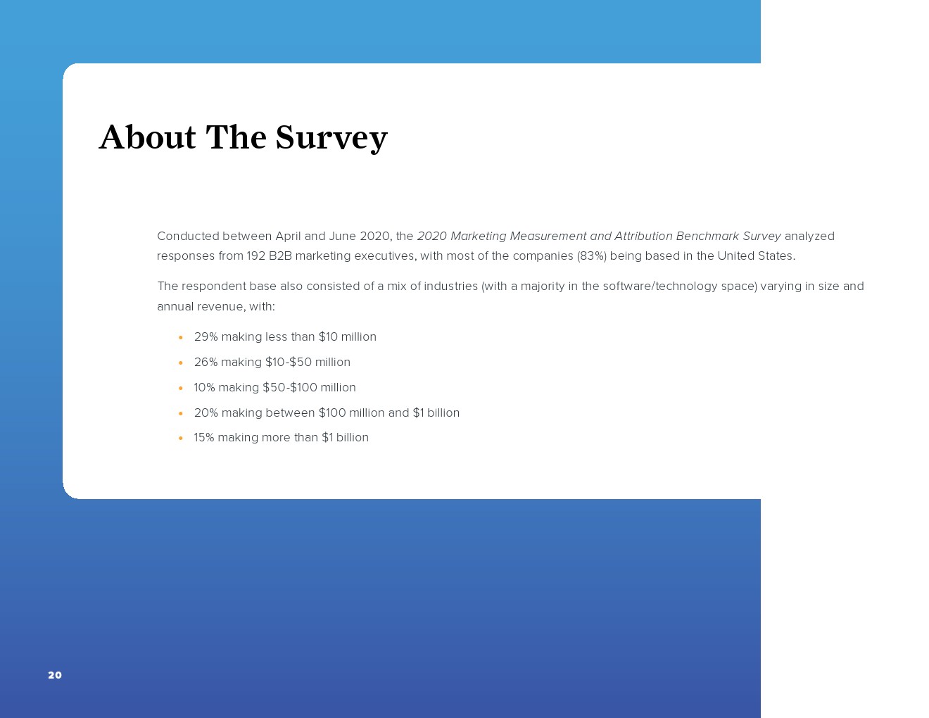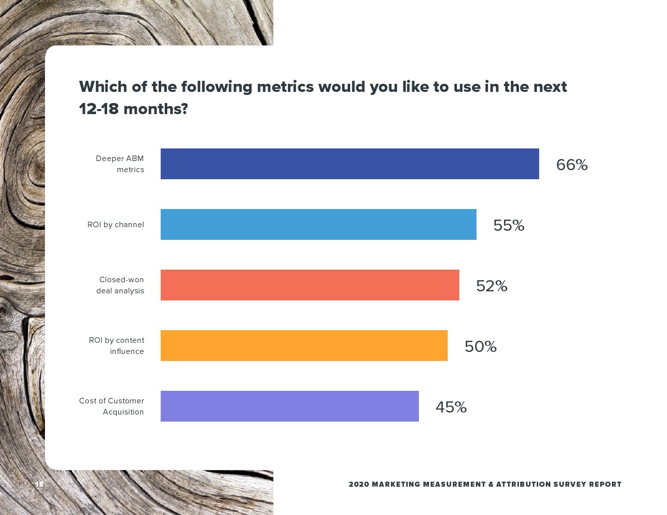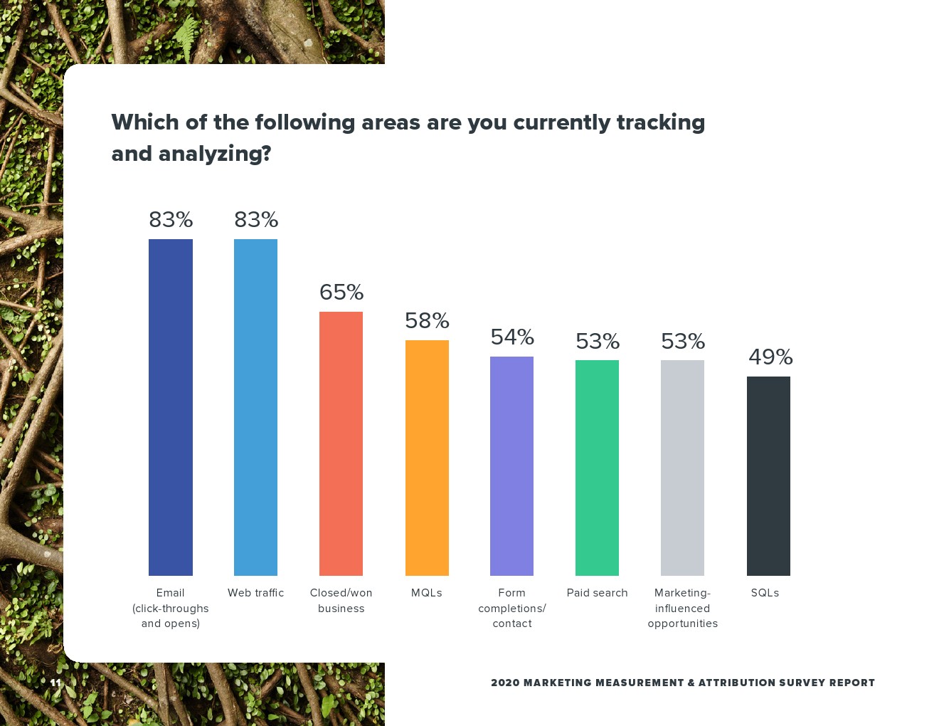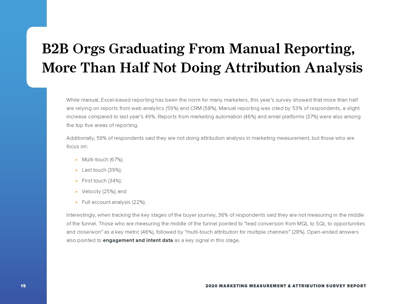 虽然53%的受访者使用了人工报告,但大多数人依赖网络分析(59%)和CRM(58%)的报告。用于报告的其他常见领域包括营销自动化(46%)和电子邮件平台(37%)。