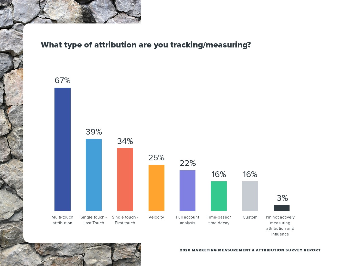 近6/10的受访者(59%)在他们的营销测量中没有进行归因分析。但是,在剩下的41%的受访者中最常用的是多点触控归因(67%)。
