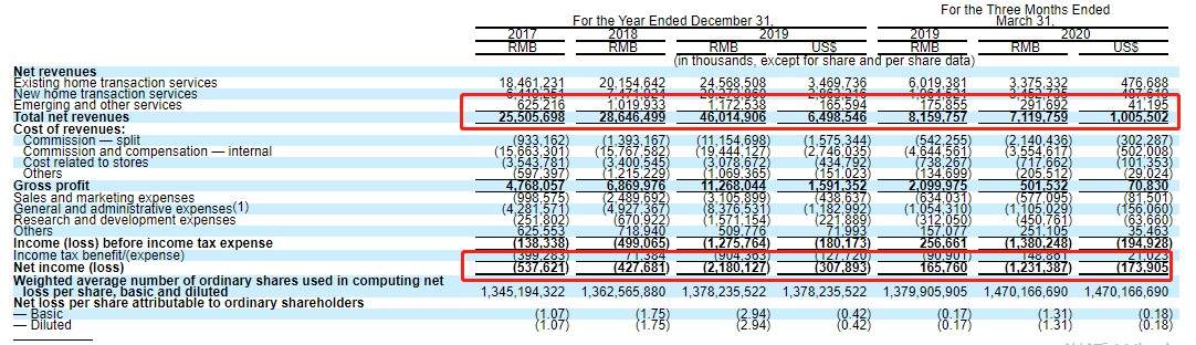 截止至2020年3月31日的前3个月,贝壳的营收为71.2亿,同比降低13%。该公司指出,今年一季度营收降低的主要原因是卫生事件带来的不利影响。同期净亏损12.3亿元,去年同期为净利润1.66亿元。