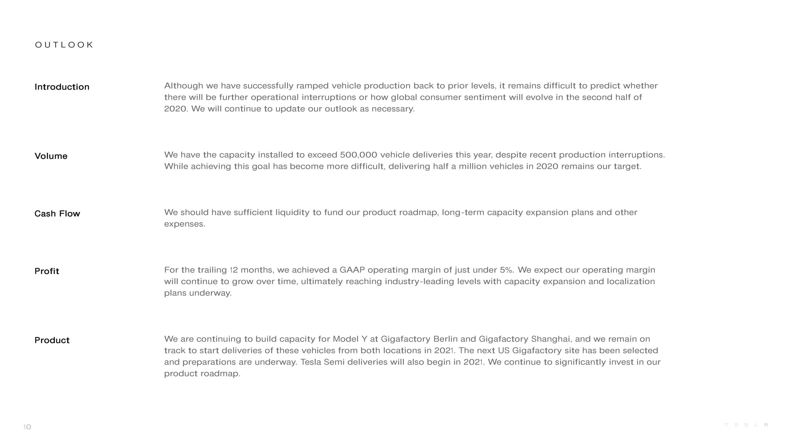 产能和交付:尽管最近出现了生产中断,但特斯拉今年的产能已超过50万辆。尽管实现这一目标变得更加困难,但在2020年实现50万辆汽车仍是公司的目标